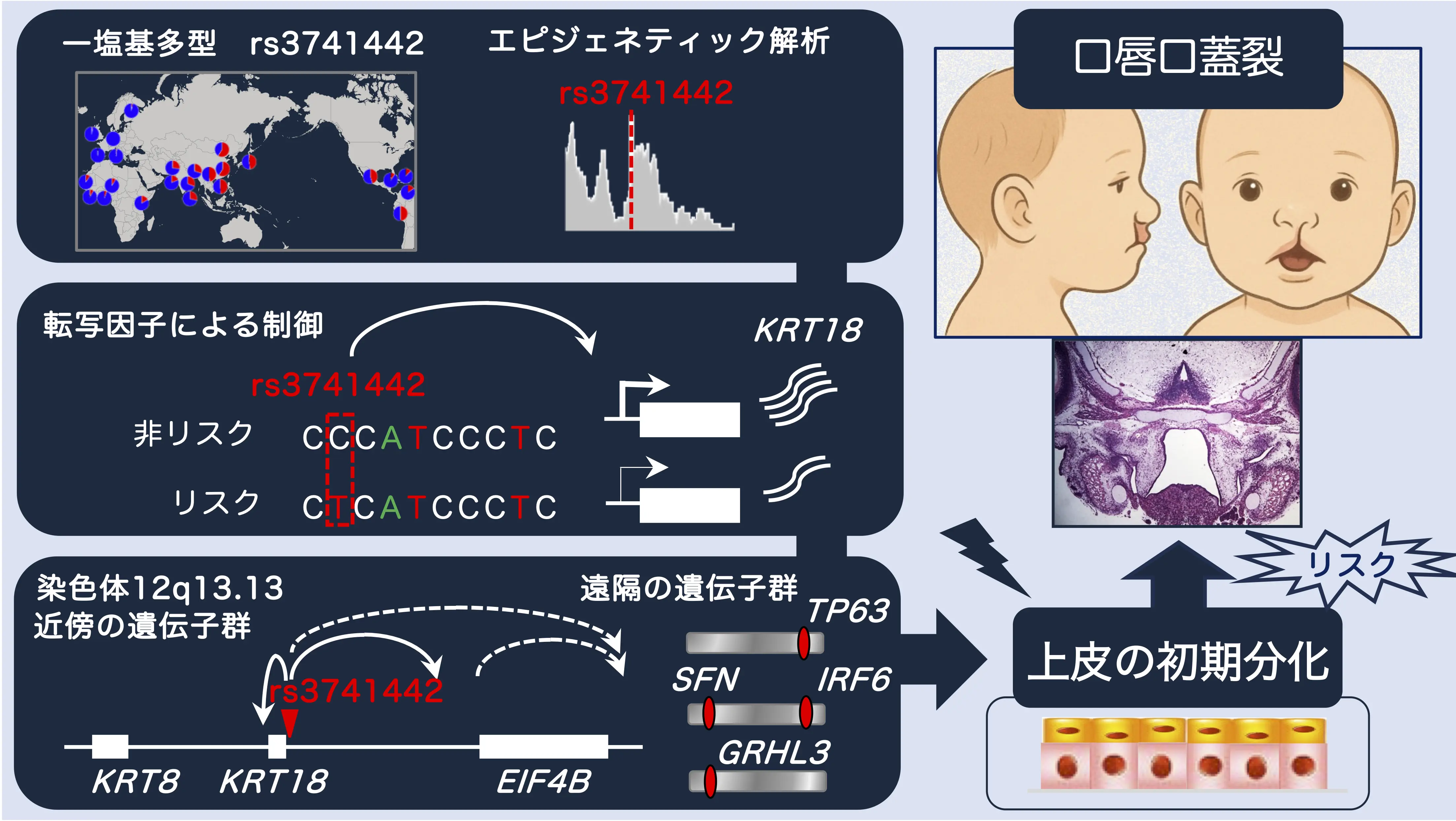 - エピジェネティック解析および機能解析に加え、ゲノム編集を用いたヒト細胞の実験により、rs3741442が上皮の初期分化に関与する遺伝子群の発現に影響を及ぼすことを示しました。
