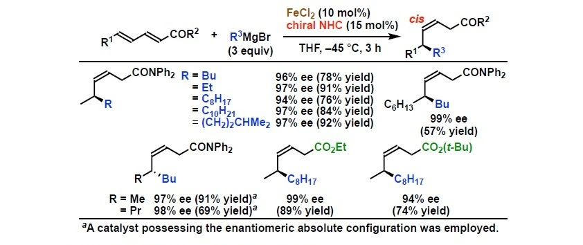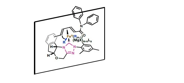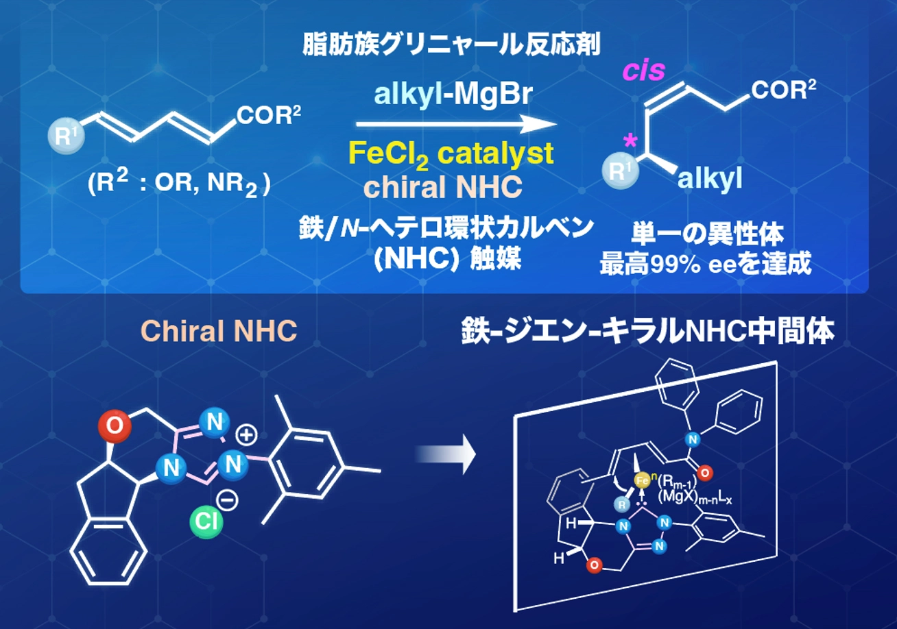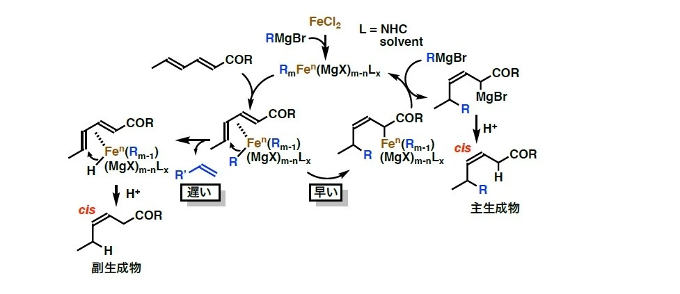 - 豊富で安価な鉄を用い、これまで制御が極めて困難だった脂肪族グリニャール反応剤による不斉1,6-付加を世界で初めて実現。