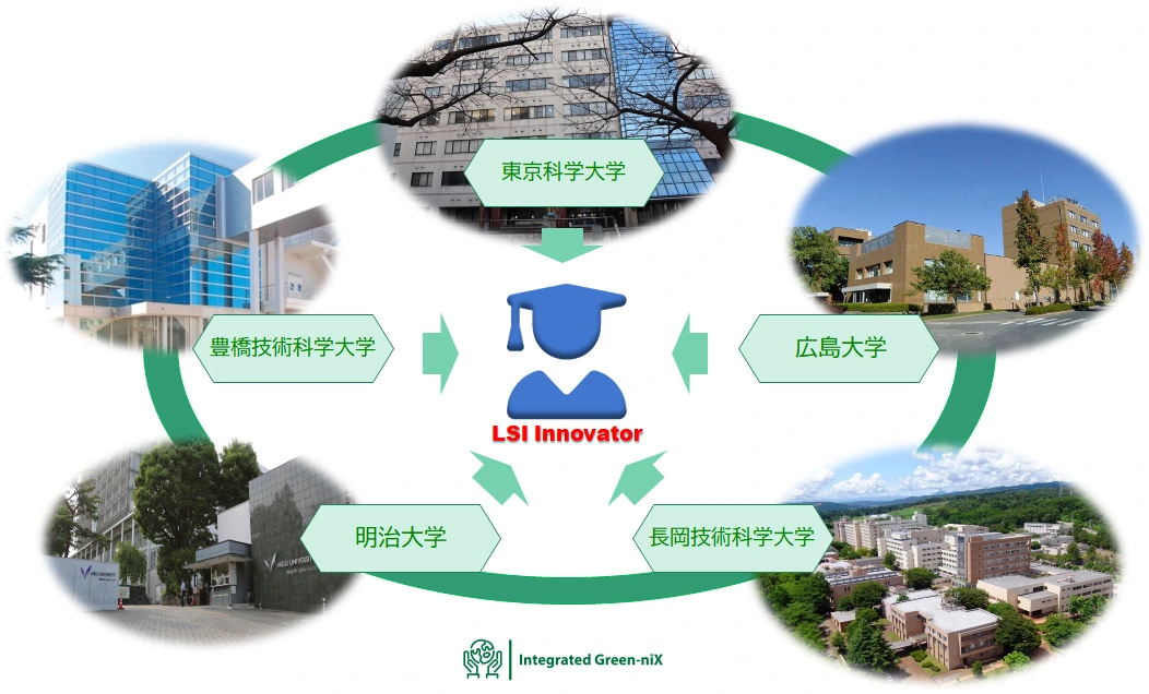 単位互換覚書は、集積Green-niX(グリーンニクス)研究・人材育成拠点[用語1]の活動の一環として、将来半導体業界を牽引するLSI Innovator(エル・エス・アイ・イノベータ)[用語2]の卵を育成することを目的としています。今回、締結した参加覚書は、2024年1月1日に東京科学大学(締結当時:東京工業大学)、豊橋技術科学大学、広島大学の3大学間で締結していた覚書の対象大学を、5大学へ拡張するものです。本参加覚書の締結により、対象となる学生は、4月から新規参入の2大学での開講科目を加えて拡張されたGreen-niX対象科目[用語3]を所属大学の垣根を越えて履修(遠隔の大学から座学の講義をオンライン受講可能)し、自身が所属する大学の単位として取得できるようになります。今回、新たに明治大学、長岡技術科学大学が加わることで、Green-niX対象科目の相補性が向上し、LSI Innovatorに求められる網羅的な基礎知識や高度な専門知識の学修効果がより一層高まることが期待されます。