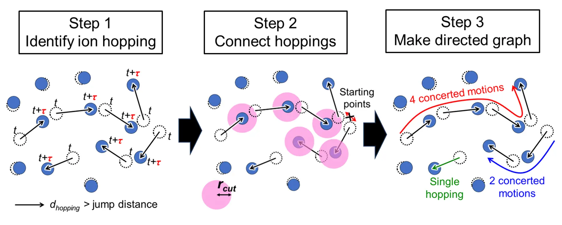 分子動力学シミュレーションでは、イオンの運動方程式を数値的に解くことで、固体中のイオンがどのように動くかを再現します。本研究では、このシミュレーション結果を「イオンが元の安定位置から別の位置へ1回跳ぶかどうか」という短い時間(τ)に区切って解析しました。この短時間では、跳んだイオンの動きは矢印(変位ベクトル)として明確に表すことができます。次に、各変位ベクトル同士が「時間的にも空間的にも近い」場合を、相関のある一連の運動として扱います。空間的な“近さ”は、van Hove 相関関数[用語6]に基づいて定めた相関距離 rcut を用いて判断します。具体的には、あるイオンが跳んだ終点と、別のイオンが跳び始める起点が rcut 以内にある場合、その2つの跳躍は互いに関連した出来事とみなし、変位ベクトル同士をつないでいきます。このようにして得られた変位ベクトルの連結は、有向グラフとして表現され、イオンが“玉突き”のように連動して動く協奏的輸送の経路を可視化します。さらに、この協奏的経路上で「どのイオンが動いたか」にはこだわらず、あたかも1つのイオンが τ の間にどれだけ距離を稼いだかを算出することで、見かけの拡散係数を定義し、イオン伝導度の計算へと結びつけています。