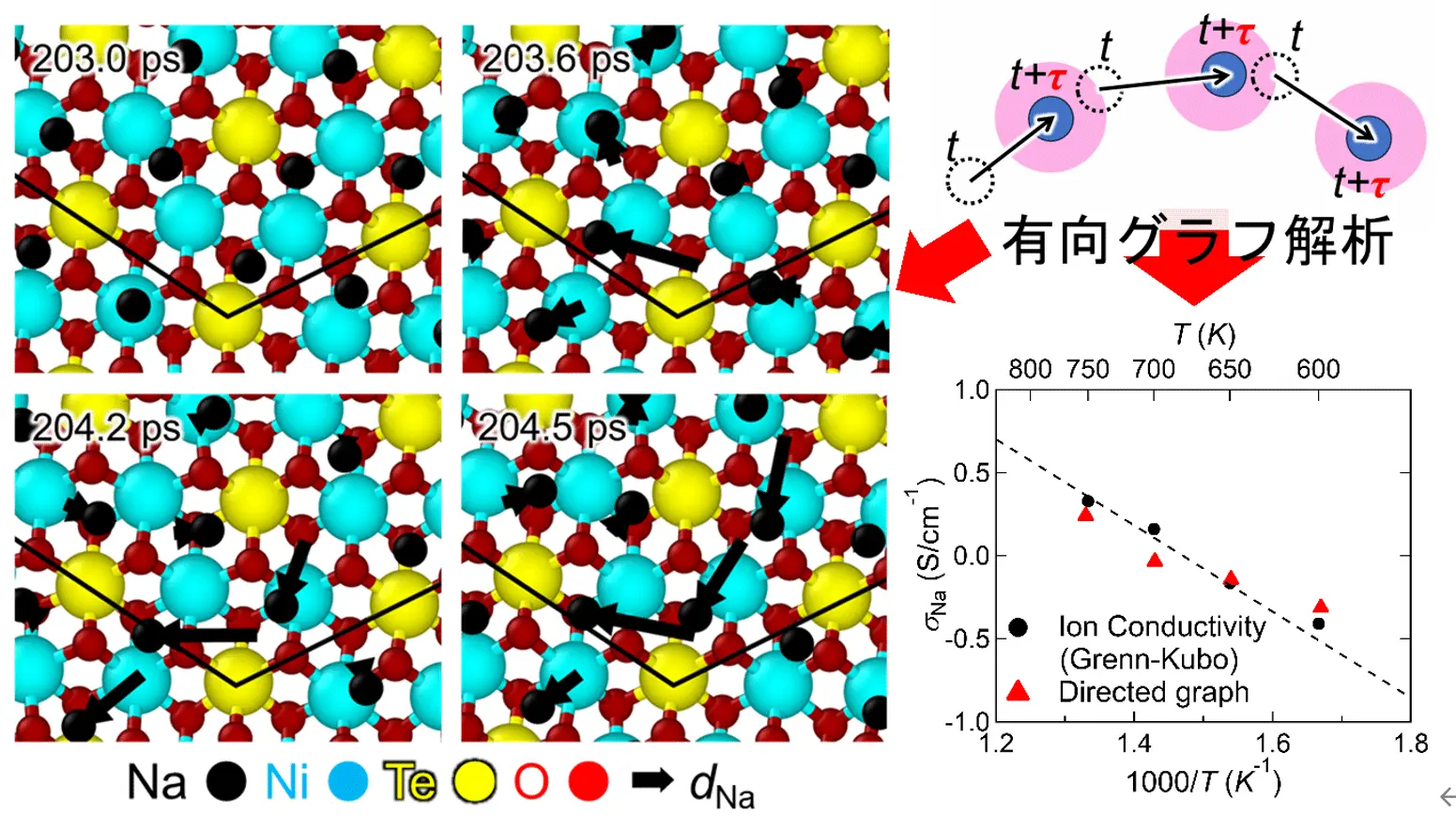 さらに、この協奏的な輸送経路の「端から端までの見かけの移動距離」を用いてイオン伝導度を計算すると、図中の赤三角で示すように、厳密な統計力学に基づく Green–Kubo公式[用語7]の計算結果を精度よく再現できることが確認されました。すなわち、変位ベクトル(矢印)をつないで協奏的輸送を表すというシンプルな描像でありながら、実際のイオンの集団運動を正しく捉えたモデルであることが実証されました。