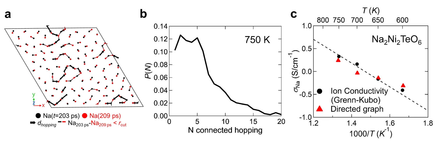 - Green–Kubo 公式:電気伝導度・熱伝導率・イオン伝導度などの輸送係数を、統計力学の線形応答理論から求めるための厳密な公式。イオン伝導度の場合、材料中を流れる電流の“時間相関”(電流がどれだけ長く持続するか)を分子動力学シミュレーションから計算し、その積分値として伝導度を求める。この式には、異なるイオン同士の速度の積が現れるため、イオン間の相互作用や協奏的な集団運動の効果が自然に含まれる。一方で、「何個のイオンがどのように協奏して動いたか」という因果構造までは直接読み取れない。本研究のモデルは、この因果構造を明示しつつ Green–Kuboの厳密な伝導度と一致する点が特長である。