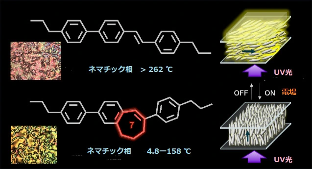 - 高融点の棒状の有機π電子系分子に柔軟性のある環状構造を導入し、室温で「ネマチック液晶」を実現
