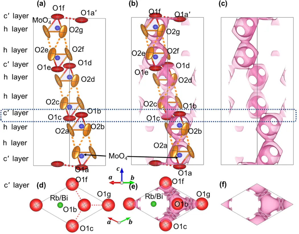 Rb5BiMo4O16が高い酸化物イオン伝導度を示す原因を解明するため、19℃から540℃の温度範囲で中性子回折実験[用語7]を行い、リートベルト法[用語8]により結晶構造を解析しました。その結果、Rb5BiMo4O16はMoを含み、酸素が欠損した立方最密充填c'層と2つの六方最密充填h層が 交互に積み重なった構造を持つことが明らかとなりました(図4a)。この構造は、MoO4四面体とRbとRb/Bi原子から成ると見なすこともできます。MoO4四面体は1つのMo原子を中心に置いた1つの頂点酸素と3つの側面酸素から構成されます(図5a)。解析した構造において、酸素原子が極端に大きな異方性熱振動を示すことが分かりました(図4a、5a)。この酸素原子の大きな変位は大きな熱振動を示しており、これが高い酸化物イオン伝導度の原因の一つであると考えられます。また、この酸素原子の変位の方向、第一原理分子動力学(AIMD)シミュレーション[用語9](図5)、結合原子価法により求めた酸化物イオンのエネルギー図(図4)などから、MoO4四面体の回転が生じていることが分かりました。この回転により、四面体内の酸化物イオンが四面体内を移動します。また、四面体間を酸化物イオンが移動することも、大きな酸素原子の変位の方向および結合原子価に基づいた酸化物イオンのエネルギー図(図4のオレンジの点線と赤の点線)から示唆されました。パルミエライト型構造ではMoO4四面体のユニークな配置により、MoO4四面体間の酸化物イオン移動が起こり、高酸化物イオン伝導性を発現すると考えられます。また、RbのサイズはSrより大きく、MoのサイズがVより大きいので、同じパルミエライト型構造を持つSr3V2O8(図3bのピンク色の線)に比べてRb5BiMo4O16(図3bの赤色の線とダイヤの記号)では酸化物イオンが移動するエネルギー障壁と酸化物イオン伝導度の活性化エネルギーが低く、そのため480℃以下の中低温で高い酸化物イオン伝導が生じると考察されました。
