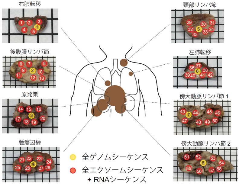 本研究は、転移性尿路上皮がんの病理解剖例において、腫瘍部位間で抗PD-1療法に対する反応の違いを研究対象としました。原発巣と転移巣合わせて8部位の評価病変うち、原発巣や傍大動脈リンパ節の転移巣の一部、頸部リンパ節の転移巣には免疫療法の効果がみられたものの、腫瘍辺縁や肺、傍大動脈リンパ節の転移巣の一部、後腹膜リンパ節の転移巣には効果がみられませんでした。そこで我々は、これら8部位を対象に、各部位の全ゲノムシーケンス[用語3]を行い、さらに8部位に対して図1に示す合計58箇所の評価点を設定して多領域全エクソームシーケンス[用語4]・RNAシーケンス[用語5]を行いました。