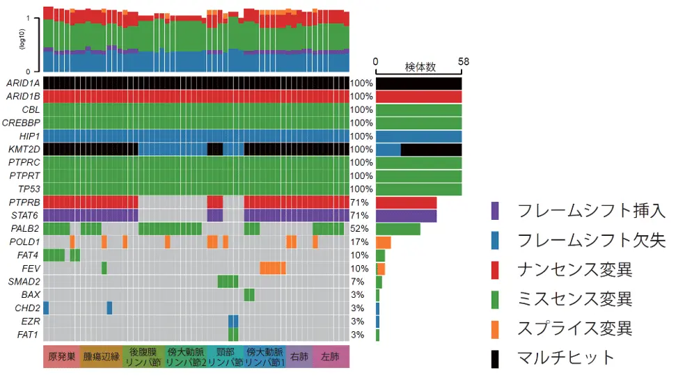 全ゲノムシーケンスの結果、同一患者内で8部位の腫瘍にはそれぞれパターンの異なる遺伝子変異が見られました。全エクソームシーケンスを行うと、多くの変異のパターンは臓器内・臓器間を問わず一致していましたが、一部の変異のパターンは同一臓器内でも異なっていました(図2)。多くの遺伝子変異は部位と部位の間で共通するものの、部位ごとに特異的な変異やコピー数の多型、構造異常、活性化された生物学的経路も存在することが示唆されました。この検討から、同じ臓器内でも異なる場所で異なる表現型が誘導される可能性があることが明らかになりました。