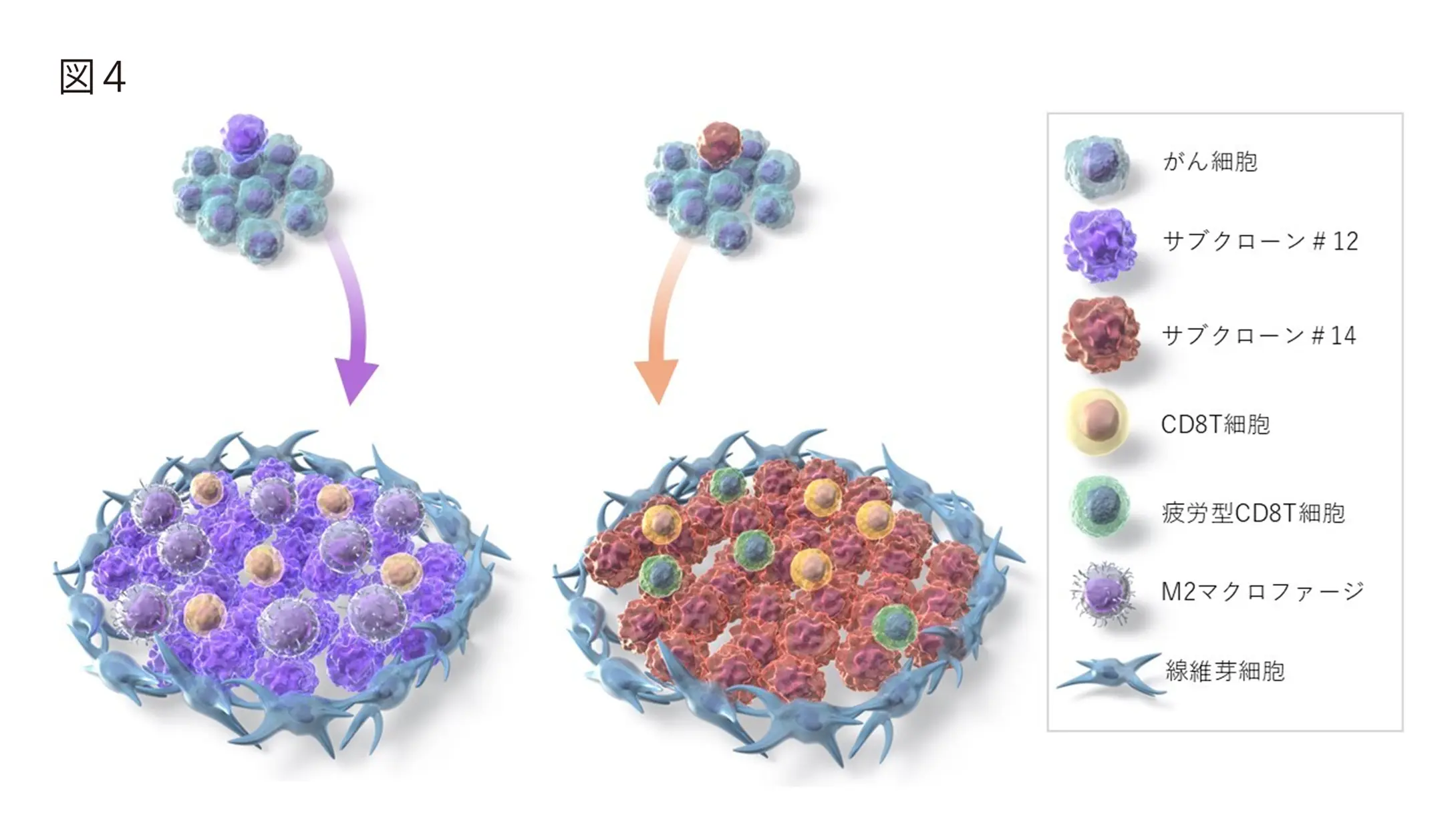 また、遺伝子発現解析により、細胞表現型が2つの悪性サブクローン間で顕著に異なり、サブクローン#12はがん幹細胞性の特徴を示し、サブクローン#14は細胞増殖能の亢進を示すことが明らかとなりました。これらの結果は、シングルセルRNAシーケンスデータでも確認され、空間トランスクリプトミクスから得られた悪性サブクローンの特徴がより明確化されました。以上から、悪性サブクローン#12と#14は、単一細胞レベルでも異なるがんプロファイルを持ちつつ同一患者内で共存し、固有の免疫抑制環境を形成していることがわかりました(図4)。