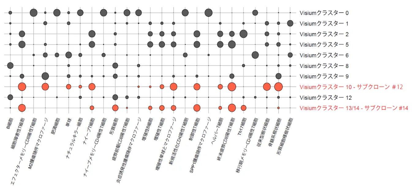 次に、空間トランスクリプトミクスや単一細胞解析を行いました。サブクローン#12と#14が生息する部位を対象に解析を行い、サブクローン#12・#14のマッピングを行いました。まず、悪性サブクローンに特徴的なマーカー遺伝子を定義し、空間トランスクリプトームデータを組み合わせることで、サブクローン#12・#14に対応する、空間トランスクリプトミクス上の細胞集団を同定しました(サブクローン#12:Visiumクラスター10、サブクローン#14:Visiumクラスター13/14)。続いて、空間トランスクリプトミクス上で、サブクローン#12・#14に対応する領域の免疫環境を調べたところ(図3)、サブクローン#12がみられた箇所では、細胞障害性T細胞とともに悪性なM2マクロファージの浸潤が確認されました。一方、サブクローン#14がみられた箇所では、細胞障害性T細胞の疲弊が特徴的であり、免疫の抑制がコントロールされていないことが示唆されました。
