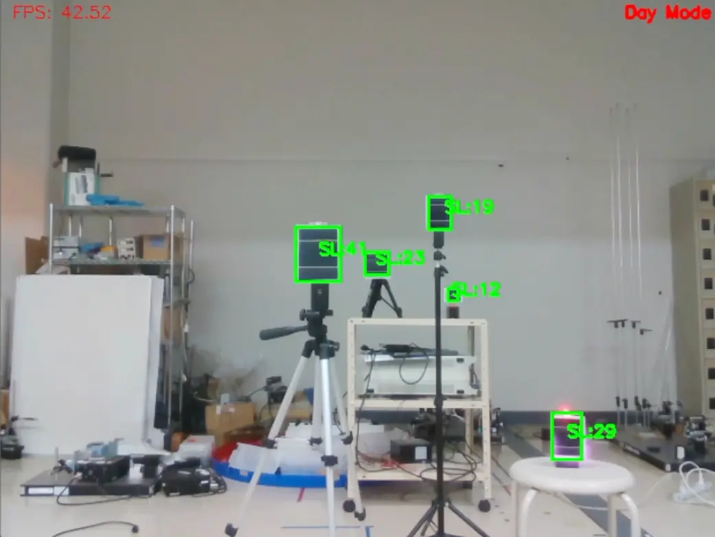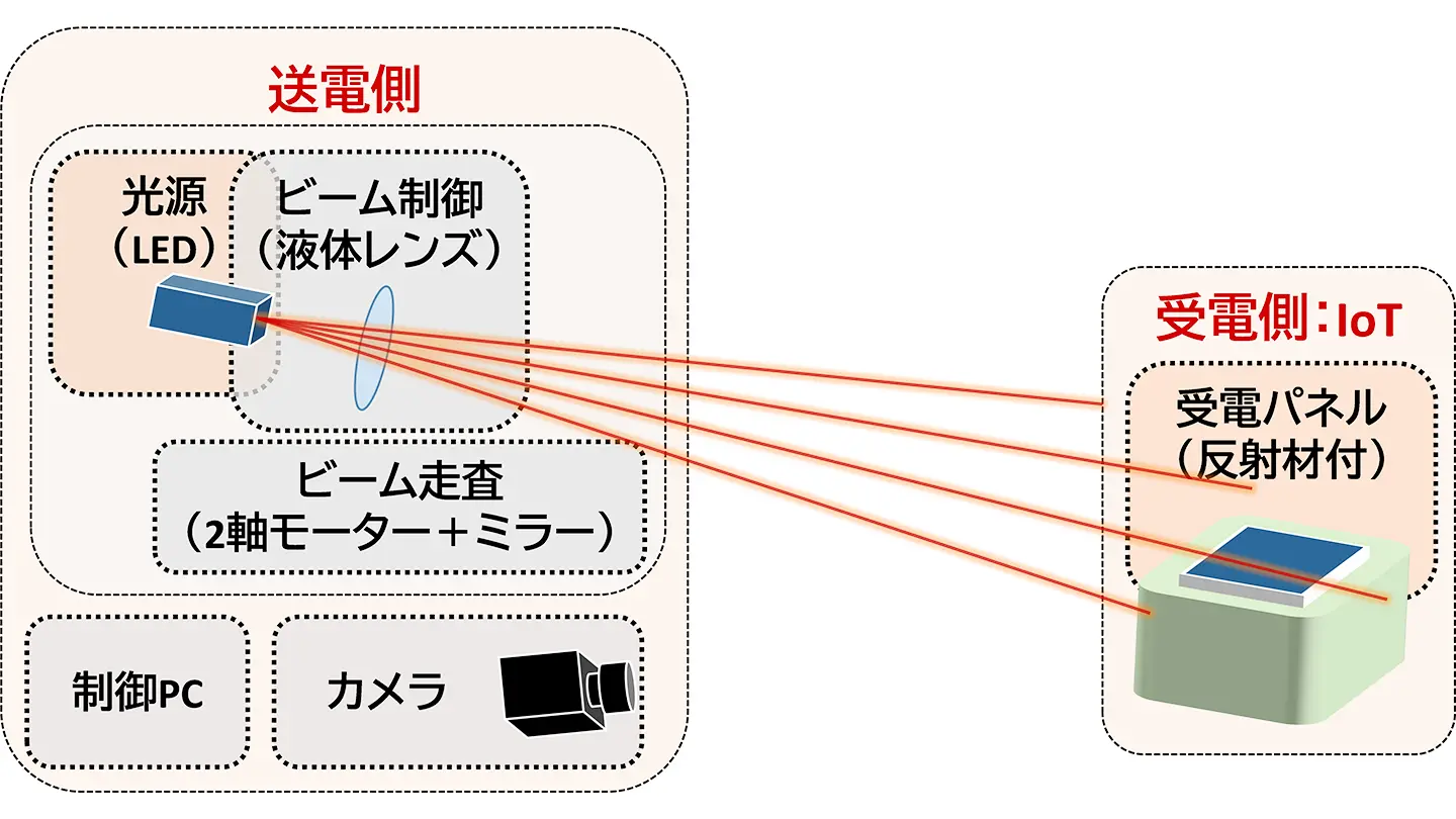 そこで本研究では、周囲の明るさに応じて自動的に動作モードを切り替え、複数のIoT端末へ効率的に電力を供給できる自動・適応型システムを開発しました。このシステムでは、照明がある明所(昼間)はRGBカメラと深層学習を用いた画像認識、暗所(夜間)では赤外線投光とレトロリフレクター(再帰性反射材)[用語3]を用いた赤外線画像処理という、異なる方法で受電対象を高精度に検知・追跡します。また、焦点可変液体レンズ[用語4]などにより、距離や受電パネルの大きさに応じて光スポットのサイズをリアルタイムに調整することで、給電量の距離依存性があるものの、最大5メートル先までの高い効率の電力伝送を実現しました。