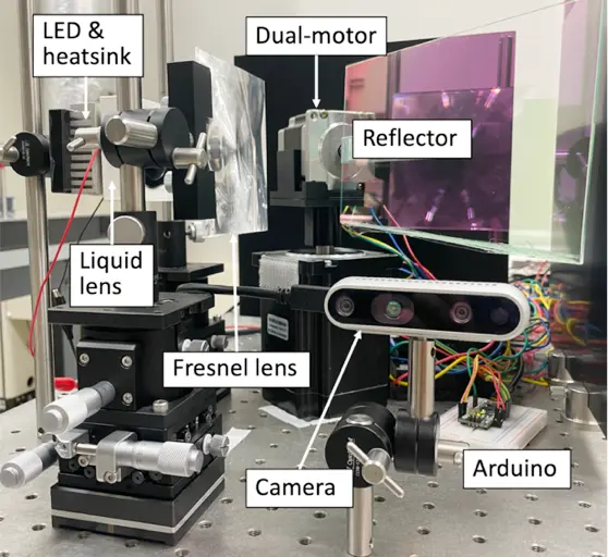 開発したOWPTシステムでは、照明がある明所(昼間)はRGBカメラと深層学習を用いた画像認識により受電パネルを検出します。一方暗所(夜間)では、赤外線投光と、受電パネルに取り付けたレトロリフレクター(反射材)を用いた赤外線画像処理によって、受電対象を高精度に検知・追跡します(図1)。さらにこのシステムでは、焦点可変型の液体レンズと、光ビームを2次元方向に狙うビーム走査機構、RGBカメラと赤外線深度カメラによる画像検出を組み合わせることで、距離や受電装置サイズに応じて光照射スポットの大きさを自動調整しながら、受電装置の追跡と正確な電力供給をおこなうことが可能です(図2)。