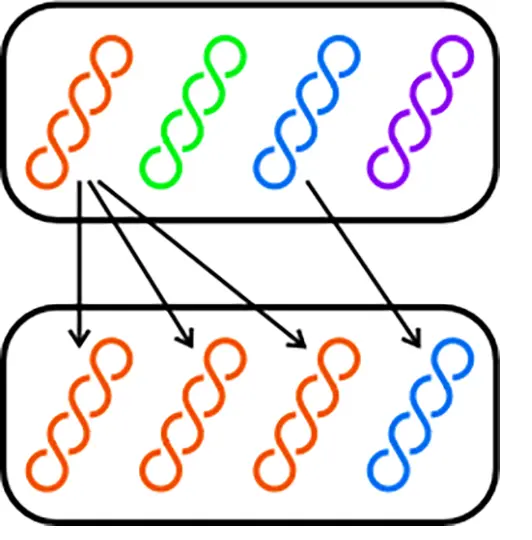 - フィッシャーの自然選択の基本定理:自然選択による進化で、生物がどの程度子孫を残しやすいかの指標である適応度が上昇する速さを記述する定理。平均適応度が増える速度は適応度の分散に比例するが、ゲノムコピー数が多いと、ひとつの変異が与える適応度の変化が小さくなり、平均適応度の増加速度は遅くなるという仮説が立てられる。