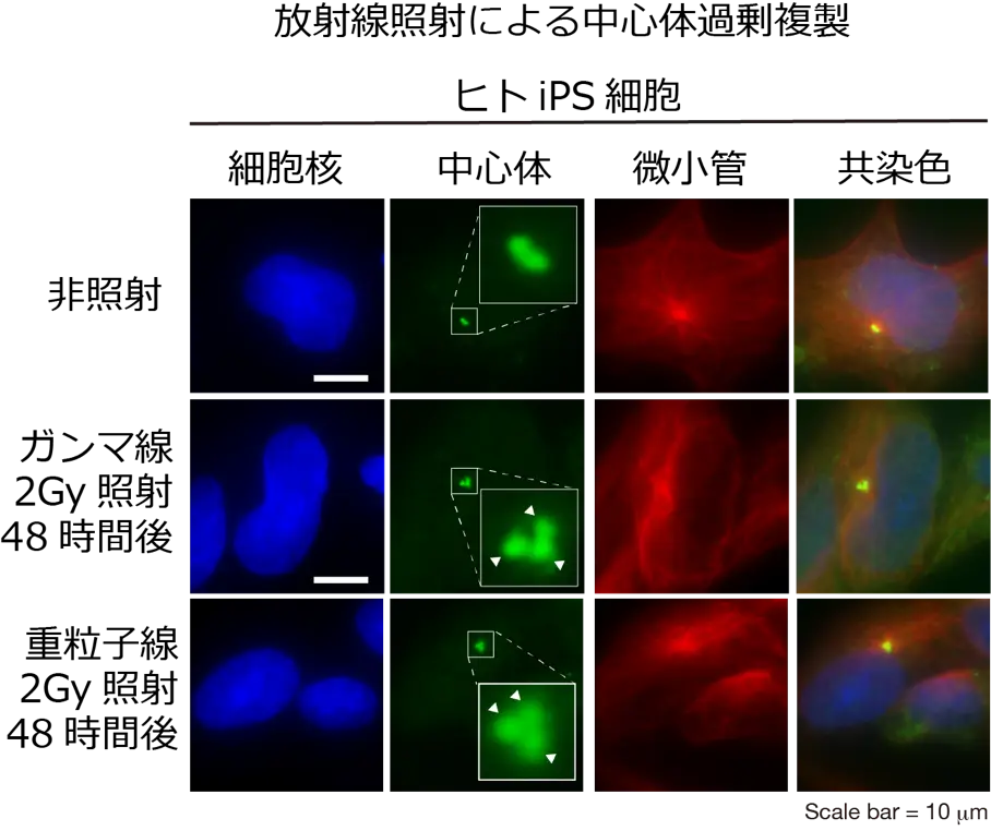 - 重粒子線がヒトiPS細胞で中心体過剰複製を増加させることを確認。