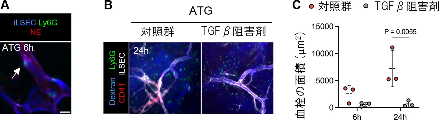 B. ATG投与24時間後に撮影された、ビークルとTGFβ阻害剤投与下を比較したライブイメージング像。血液(Dextran、青)、好中球(Ly6G、緑)、血小板(CD41、赤)、およびiLSEC(白)を可視化。