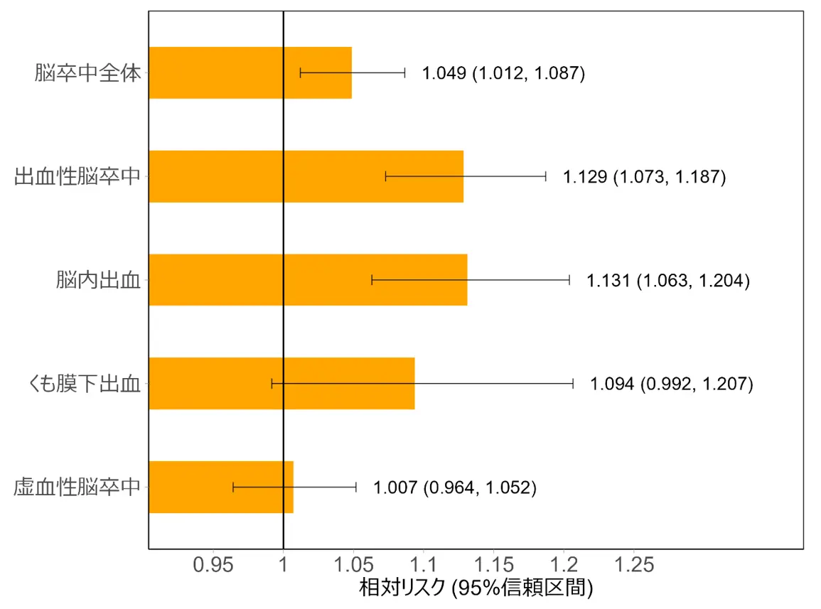 さらに、脳卒中の類型によって台風によるリスクが異なる可能性を考慮するため、脳卒中全体を出血性脳卒中と虚血性脳卒中に分けて解析を行いました。また、出血性脳卒中については、脳内出血とくも膜下出血に細分化して解析を行いました。