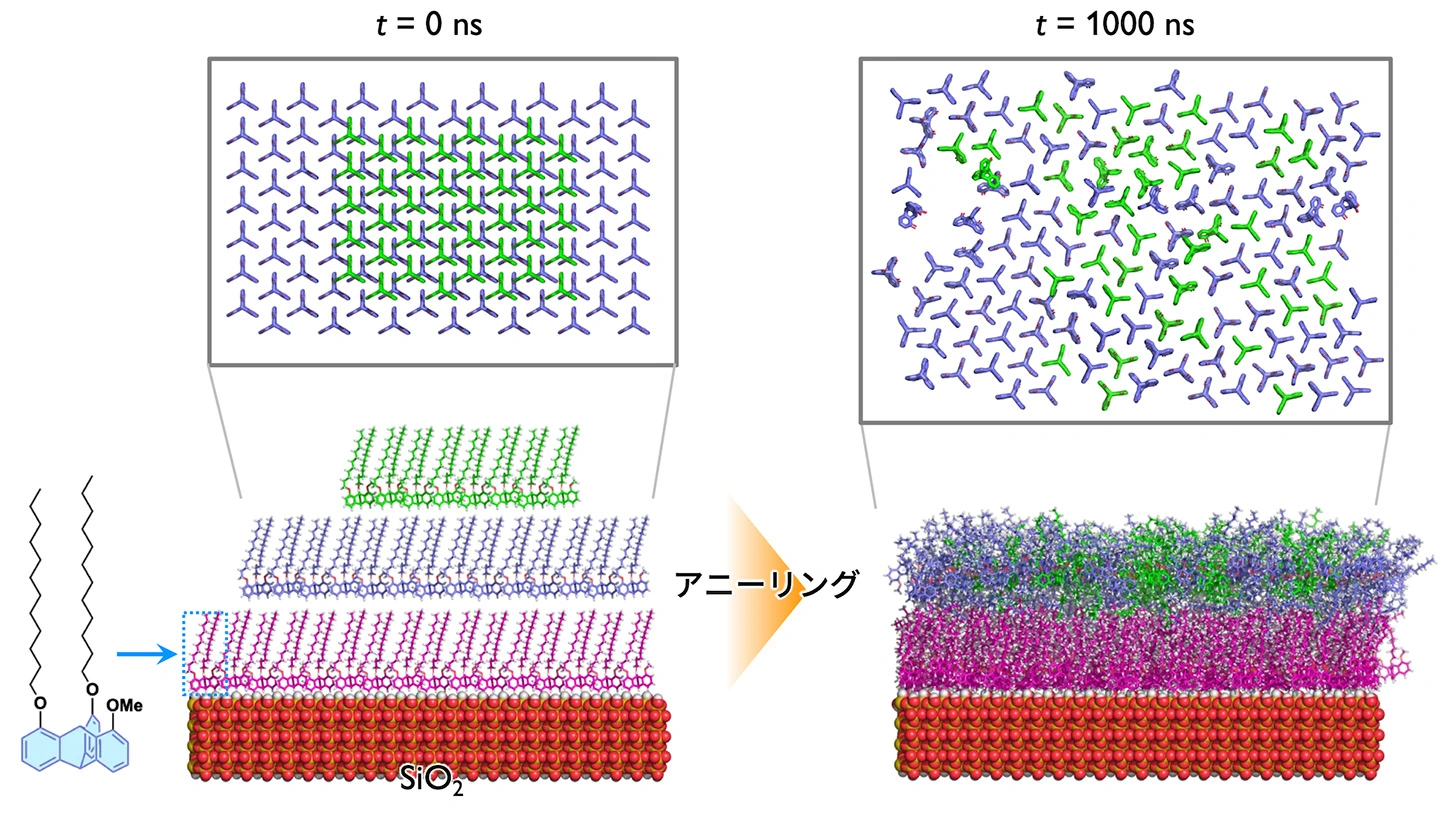 そこで本研究では、長鎖アルコキシ基を有するトリプチセン誘導体3種(Trip1、Trip2、Trip3)を対象に、バルク相、真空中の1〜4層薄膜、SiO2基板上単分子膜の条件で全原子MDシミュレーションを行い、自己組織化構造、熱力学安定性、固体表面上での秩序化プロセスを調べました。その結果、これらのトリプチセン誘導体は、バルク相では隣接分子が逆向きの反平行配向が最安定ですが、単分子膜・二分子膜など超薄膜では平行配向が優先し、固体(SiO2)表面に形成された単分子膜においても平行配向が安定に維持されることが分かりました。さらに、熱アニーリング過程のMDシミュレーションにおいて、一部のトリプチセン分子が段差状三層膜から平坦二層膜へ再編成し、その中で分子が規則的に配列した領域が成長するという過程の可視化・定量化を実現しました。本成果は、最先端計測でも直接観察が難しい「界面での分子配向の選択」や「薄膜形成ダイナミクス」を全原子MDシミュレーションにより分子レベルの描像として提示し、熱力学的に安定で高秩序な有機薄膜を設計するための指針を与えるものです。