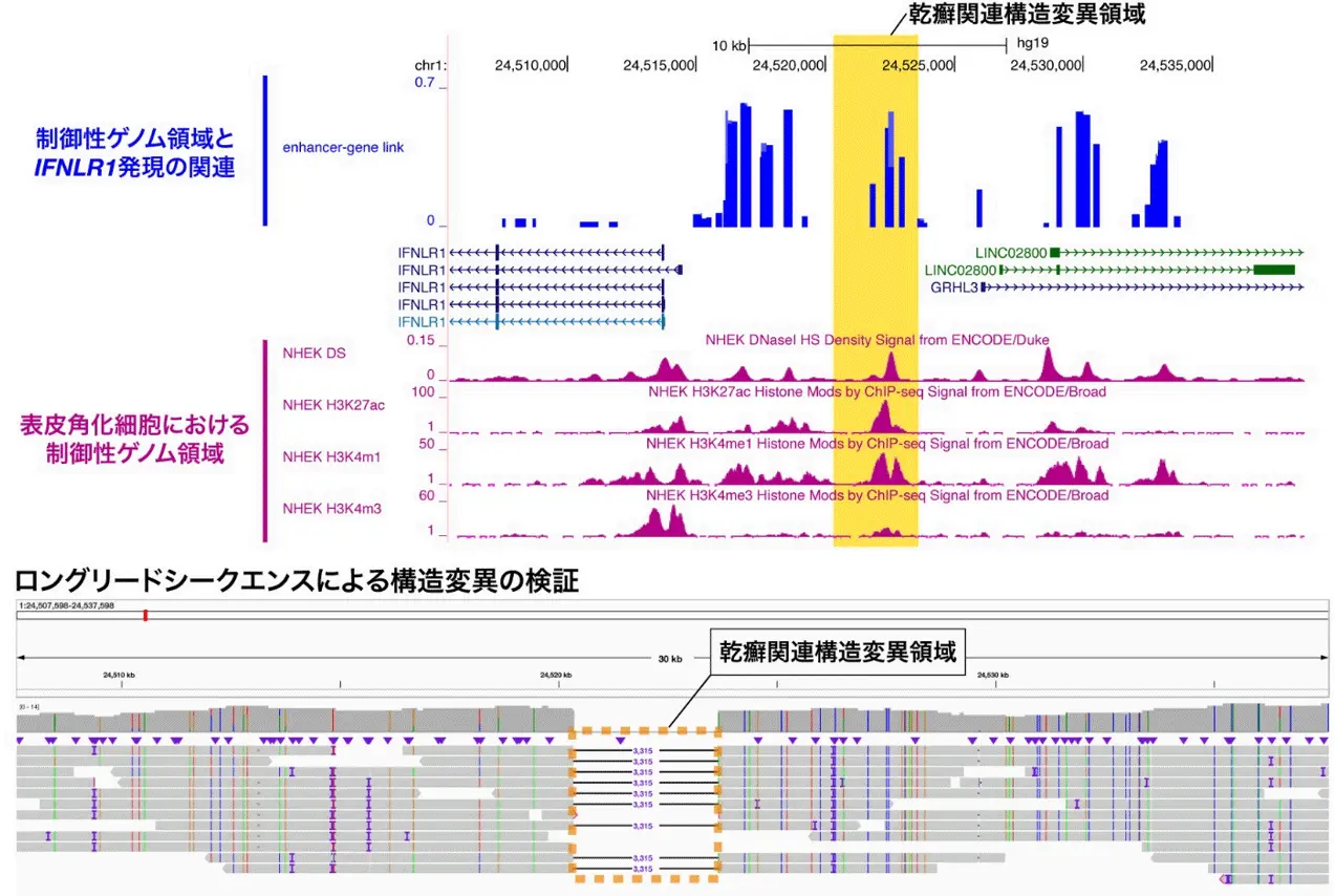 構造変異解析では、ゲノム全体に存在する22,783の構造変異を同定し、その中からIFNLR1遺伝子座に存在する3.3kbの非コード領域欠失[用語5]が、乾癬に対して有意な保護的効果を持つことを発見しました(図1)。ファインマッピング[用語6]と機能アノテーション[用語7]により、この欠失は皮膚上皮特異的エンハンサー[用語8]を破壊し、IFNLR1発現を低下させるeQTL効果[用語9]を持つことが示されました。