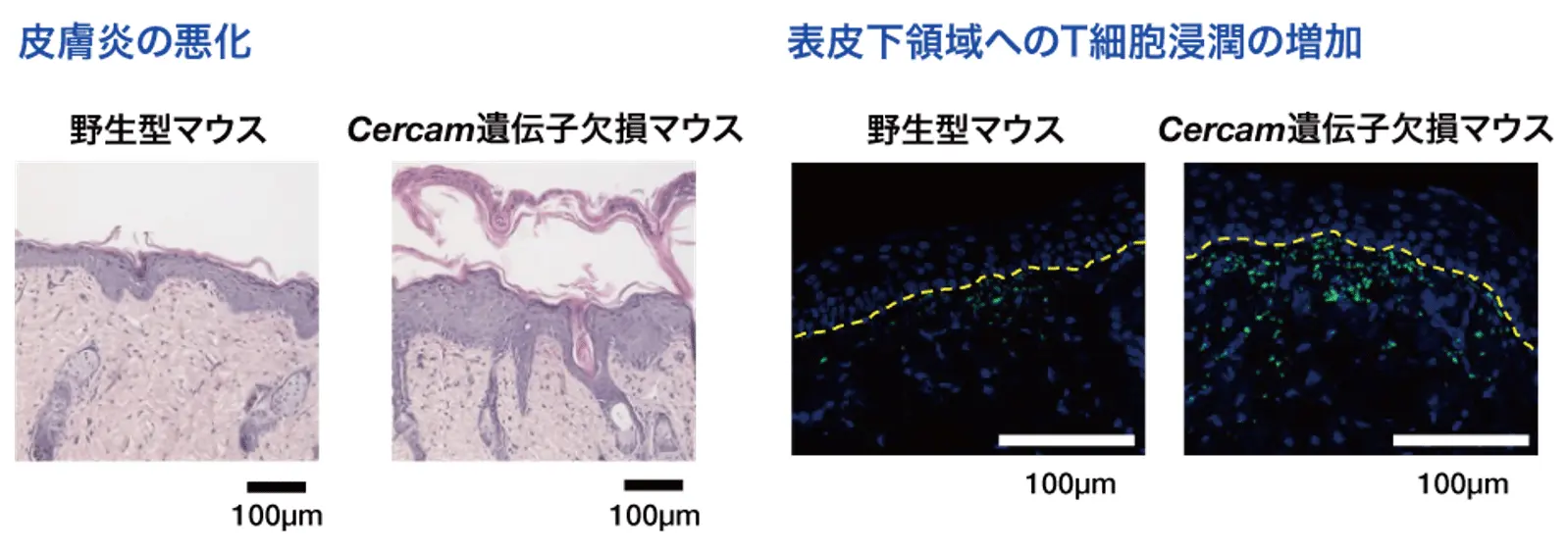 さらに、in vivo機能検証として、Cercam欠損マウスにイミキモド誘発乾癬モデル[用語12]を適用したところ、野生型マウスに比べて皮膚炎症が悪化し、乾癬関連サイトカイン[用語13]の発現上昇や表皮下領域へのT細胞浸潤増加が観察されました(図3)。