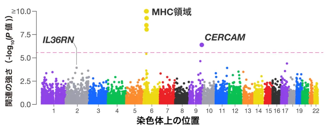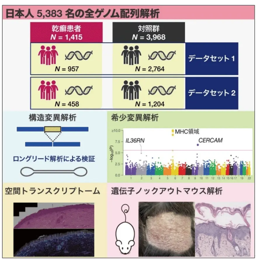 - 日本人乾癬(かんせん)患者1,415例と対照群3,968例の全ゲノムシークエンス解析を実施し、これまで未解明だった希少変異(rare variant)および構造変異(structural variant)の関与を網羅的に解析。