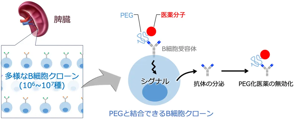 脾臓に存在する多様なB細胞の中には、PEGと強く結合できるB細胞受容体を持つクローンが存在する。これがPEG化医薬品と結合すると、B細胞受容体が抗体として分泌されるようになる。抗体はPEG化医薬品を無効化してしまう。