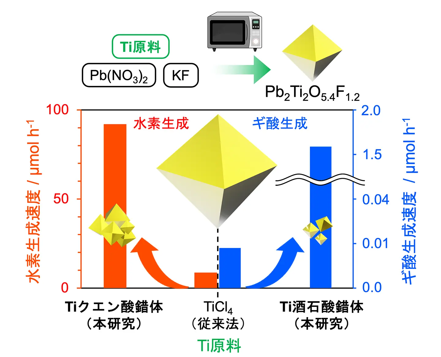 研究チームは以前の研究で、同材料が水から水素を生成したり、二酸化酸素をギ酸に変換したりする反応において、光エネルギーを吸収して活性を示す光触媒となることを発見していました。今回の研究では、低温で実施できるマイクロ波合成法[用語5]を駆使することで、高品質な酸フッ化物のナノ粒子を得られたため、光触媒反応の効率を下げてしまう電荷再結合[用語6]を効果的に抑制できました。