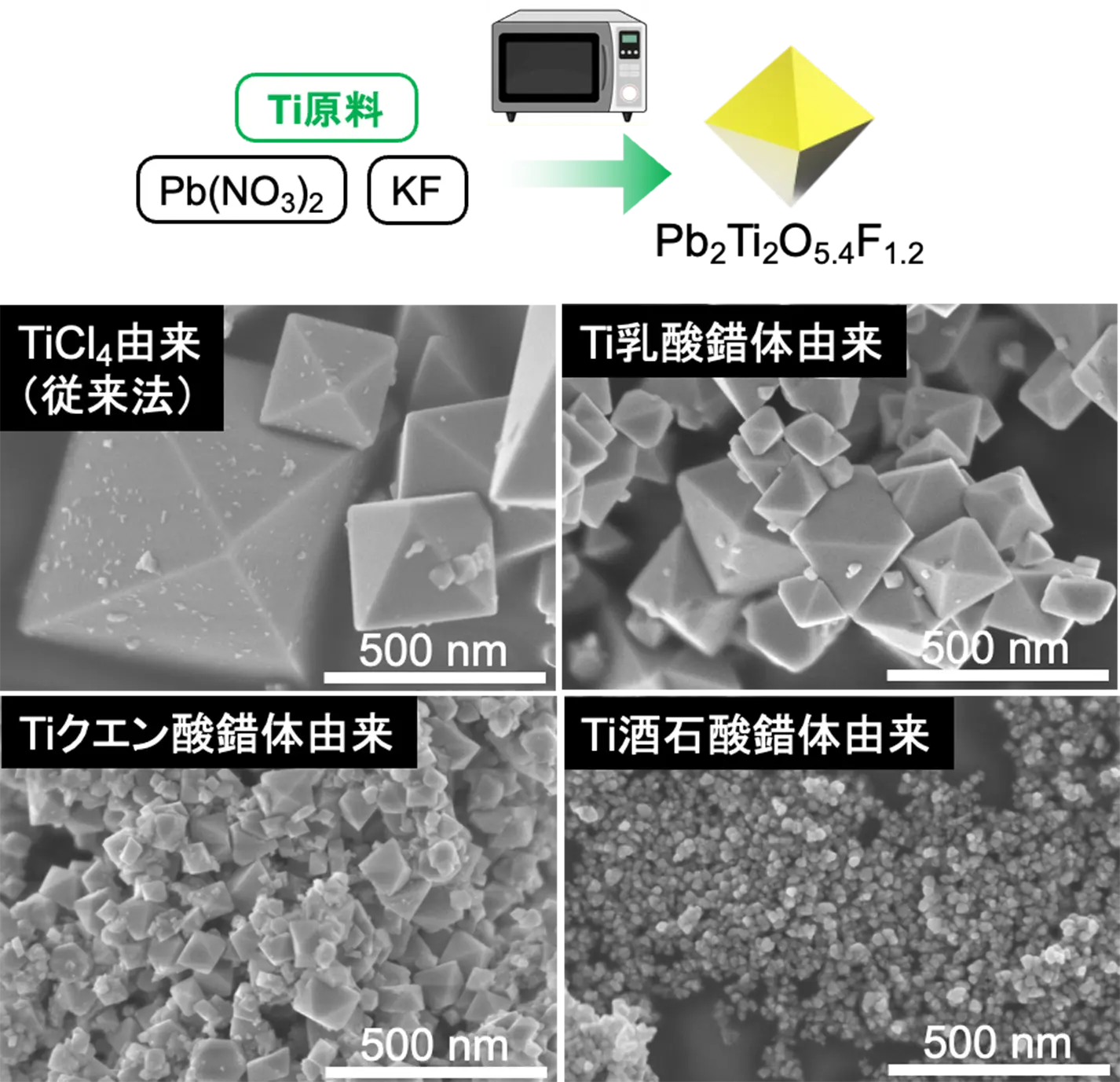 図1. さまざまな水溶性Ti錯体から合成したPb2Ti2O5.4F1.2の走査型電子顕微鏡写真。Ti原料を従来のTiCl4から水溶性Ti錯体とすることで、Pb2Ti2O5.4F1.2の粒径制御が可能。