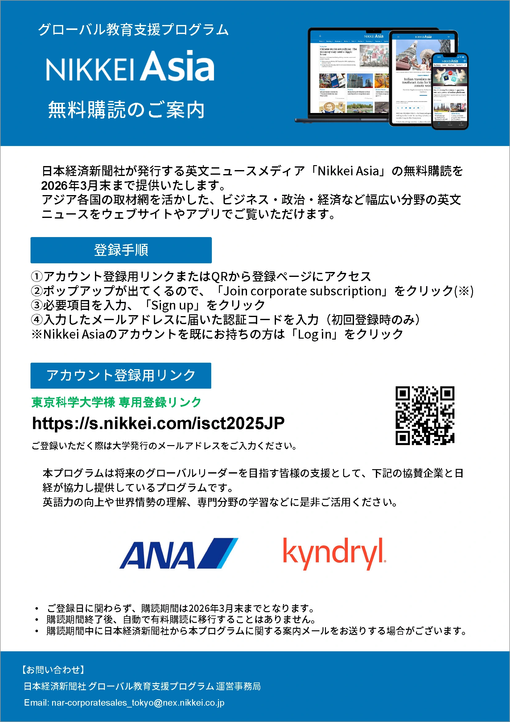 Nikkei Asiaの無料購読を提供する「グローバル教育支援プログラム」は、スポンサー企業と日経が実施する全学生・教職員向けプログラムです。皆さんのご負担なしにNikkei Asiaを 2026年3月末までご購読いただけます。