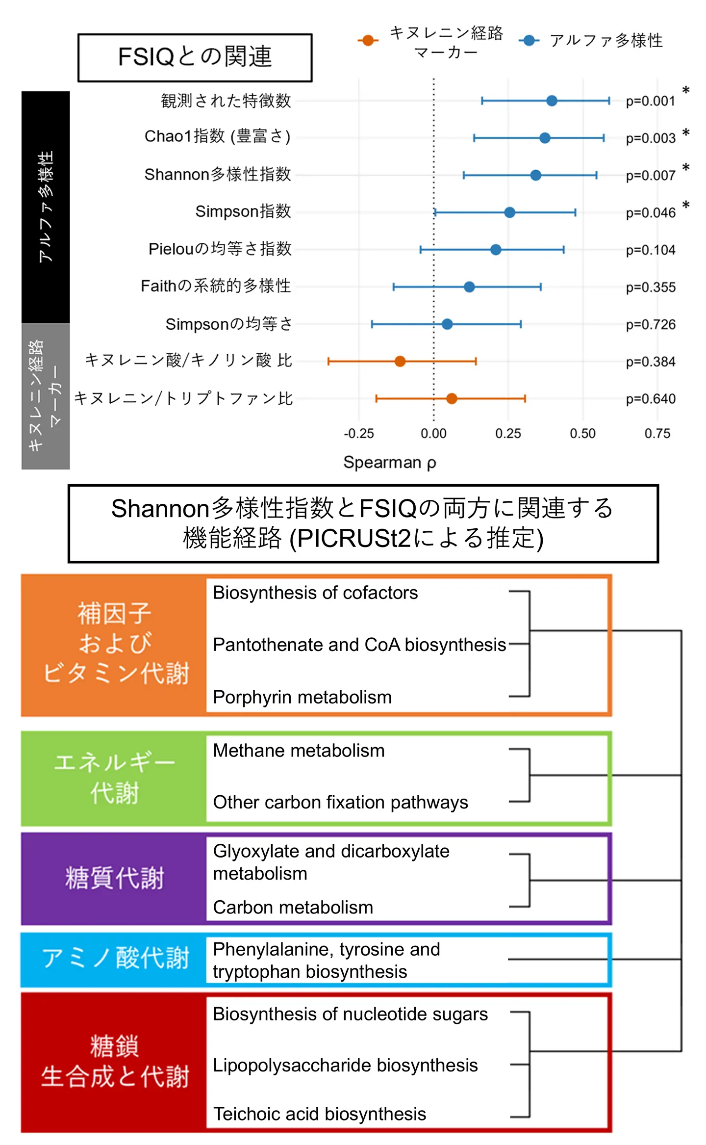 統合失調症群内の解析では、アルファ多様性(特に“豊富さ”)が高いほど、全般的認知機能が高い傾向(正の関連)が示されました。一方、神経炎症の指標であるキヌレニン経路[用語7]マーカーは、多様性・全般的認知機能のいずれとも有意な関連を示しませんでした。また、機能面では、PICRUSt2で推定した複数の代謝機能経路が全般的認知機能と関連していました。