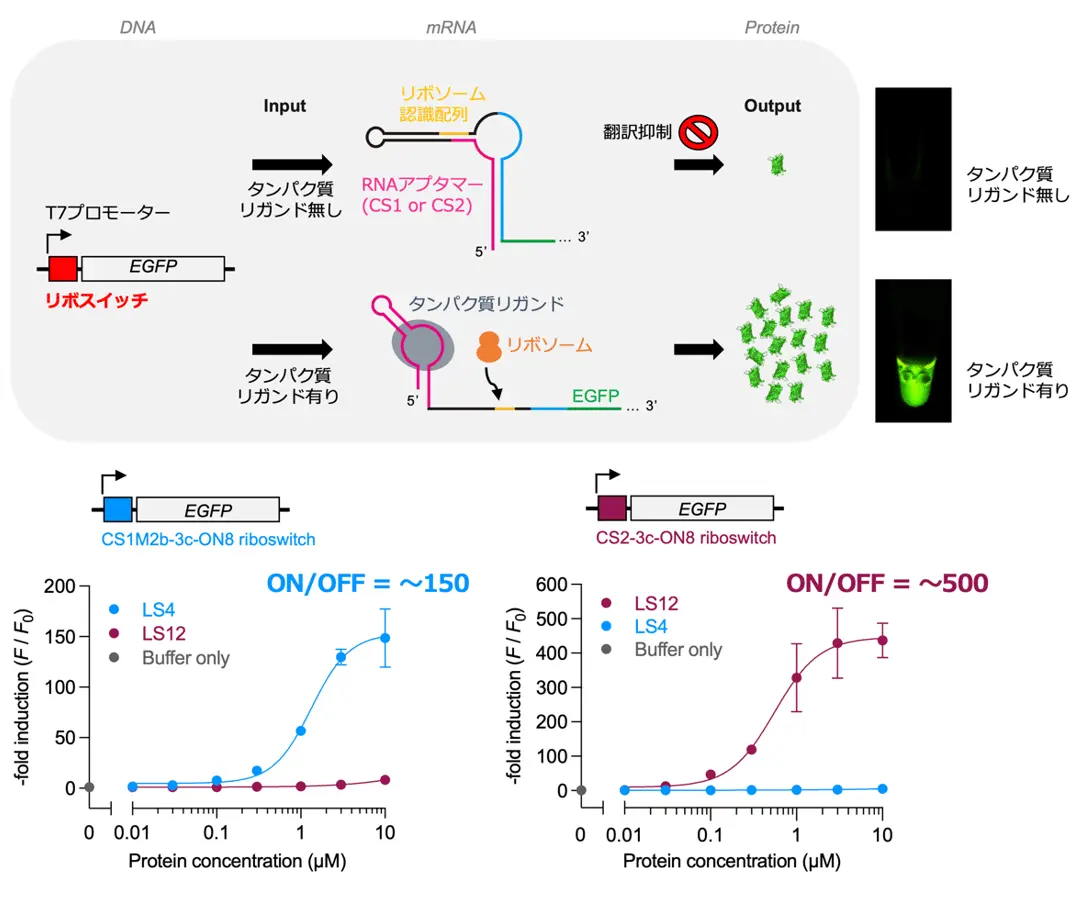 共同研究グループはさらに、無細胞転写・翻訳システムで機能するタンパク質リガンド応答型のリボスイッチの開発に取り組みました(図2)。T7プロモーター配列の直後にRNAアプタマー配列(CS1、またはCS2)を挿入し、転写時にタンパク質リガンド(LS4、またはLS12)が存在しない条件ではリボソーム認識配列を遮蔽することで、下流の遺伝子の翻訳が抑制されるようスイッチのデザインを行いました。タンパク質リガンドが存在する条件では、転写直後にタンパク質リガンドが結合のパートナーであるRNAアプタマーと複合体を形成することでリボソーム認識配列がオープンになり、リボソームによる翻訳(タンパク質合成)が行われます。つまり、タンパク質リガンドが存在する条件でのみタンパク質合成が行われるONスイッチを作製しました。蛍光タンパク質(EGFP)レポーターの発現レベルを指標にしたスクリーニングにより、ON/OFF比500に匹敵する世界最高性能のセルフリーリボスイッチを同定することに成功しました。これまでに、低分子やタンパク質などのリガンドに応答するセルフリーリボスイッチが報告されてきましたが、ON/OFF比が3桁を超えるものは知られていません。本研究では、3桁のON/OFF比を示す直交性リボスイッチ二組を開発することに成功しています。
