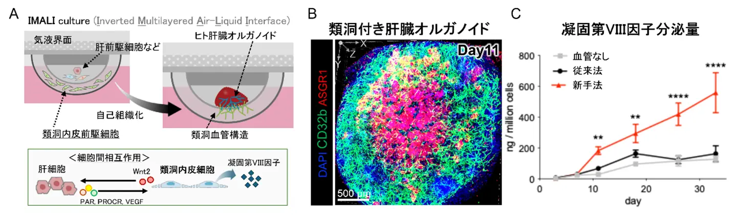 iPS細胞から分化させた肝内胚葉細胞[用語5]や肝類洞内皮前駆細胞(iLSEP)[用語6]など、4種類の前駆細胞を用い、新たに開発した気液界面培養「IMALI法」[用語7]に基づく独自の培養法によって、肝臓に特有の3次元血管構造を再構築することに成功しました。これにより、オルガノイド内の肝細胞における成熟や代謝機能が高まり、血液凝固因子を効率的に分泌することが明らかとなりました。さらに、この肝臓オルガノイドを血友病A[用語8]モデルマウスに移植したところ、出血症状の改善が確認されました。