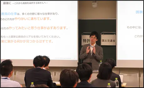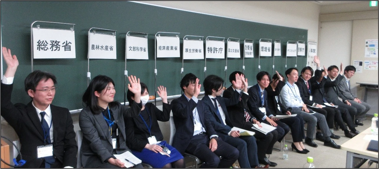 今回は、総務省、農林水産省、文部科学省、経済産業省、厚生労働省、特許庁、国土交通省、防衛省、防衛装備庁、環境省、原子力規制庁、デジタル庁、警察庁、人事院に参加いただきました。当日は、約70名の学生(学士課程、修士課程、博士後期課程)が参加しました。