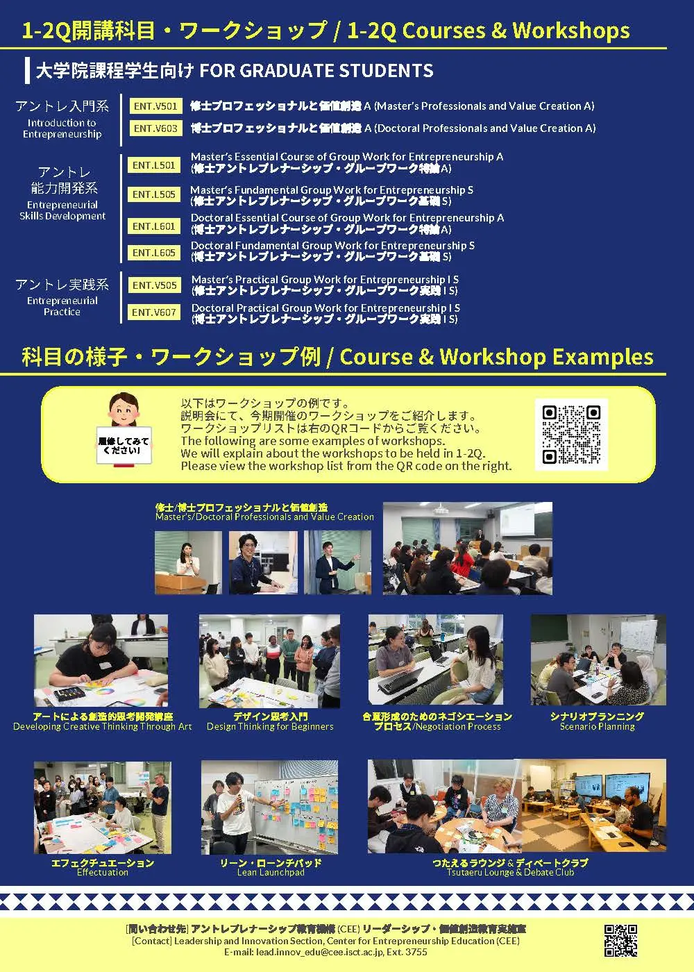 説明会では、2026年度 1-2Q に提供される500・600番台のアントレプレナーシップ(リーダーシップ、価値創造)科目とそのコンテンツであるワークショップを紹介し、科目履修(理工学系のみ対象)や単発参加(理工学系・医歯学系対象)の方法などを説明します。是非説明会にご参加ください。