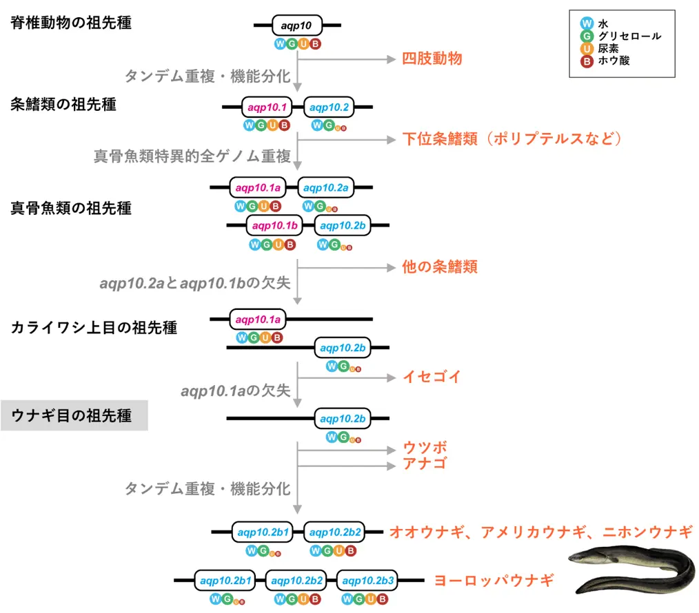 - 条鰭類に属する魚類の多くは、さまざまな溶質を透過するAqp10.1と限られた溶質を透過するAqp10.2の両方を持っていますが、同じ条鰭類に属するウナギはAqp10.1を失う一方、遺伝子重複により複数のAqp10.2パラログを獲得しました。