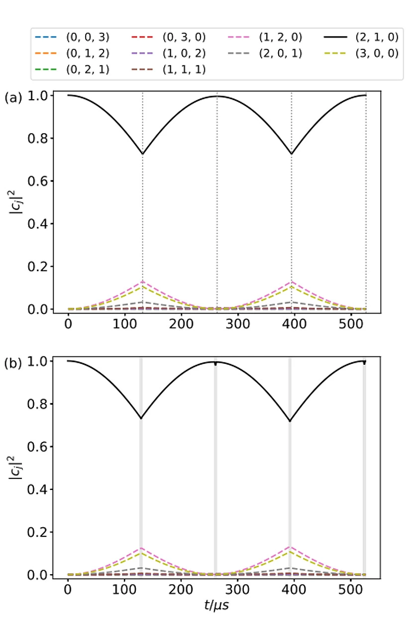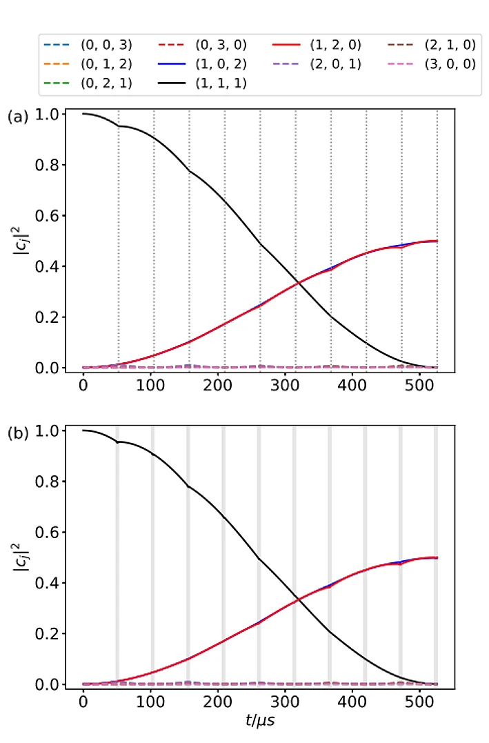 最後に、連続量型量子コンピューターにおける基本的なエンタングルメント生成素子であるビームスプリッターを、C3POを用いて実装する方法を示した。3つのモードが q2,q1,q0の順に並んでいる場合に、q1-q0間でビームスプリッターを作用させるには、q2-q1間とq2-q0間のフォノンホッピングをキャンセルすれば良い。初期状態が |ψ(t=0)⟩=|1,1,1⟩ のとき、終状態は |ψf ⟩=(|1,2,0⟩+|1,0,2⟩)/√2 となるはずであり、図3に示すように、実際に |1,1,1⟩ の占有率が減少するとともに |1,2,0⟩ と |1,0,2⟩ の占有率が増加する。