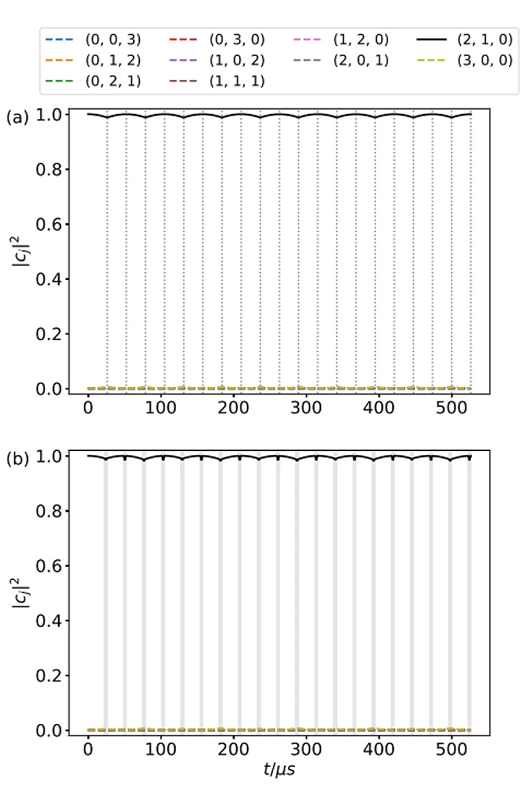 ただし、以上の結果は、π 位相シフトが瞬間的に実現できるとする理想的なDDの場合に得られたものである。実際には、π 位相シフトの適用には有限の時間が掛かり、その間もCoulomb相互作用によってフォノンホッピングが進行するため、DDの精度が下がってしまう。そこで本研究では、トラップ電極にパルス電圧を印加することによって、高速な位相シフトゲートを実装し、DDと組み合わせる手法「cancellation of Coulomb coupling by modulating harmonic potential(C3PO)」を提案した。そして、C3POを40Ca+イオンに適用する場合についてパルス電圧波形の検討を行い、 π 位相シフトが数マイクロ秒で実装できることを示した。これは、レーザーを用いた従来法においてπ 位相シフトのために数十マイクロ秒を要することと比較すると、約1桁の高速化が達成できることを示している。そこで、3モードの場合にC3POの数値シミュレーションを行ったところ、初期状態が|ψ(t=0)⟩=|2,1,0⟩ のとき、t=T/4,T/2,3T/4,T において π 位相シフトを適用した場合、エラーは 〈E〉=4.4×105となり(図1b)、π 位相シフトを20回繰り返すとエラーは 〈E〉=2.6×10-6 まで減少した(図2b)。得られたエラーは、π 位相シフトを一瞬で実装できると仮定した場合(図1a, 2a)と同程度のエラーであり、位相シフト操作中にフォノンホッピングが進行することによるエラーの増加を十分に抑えられることを示している。