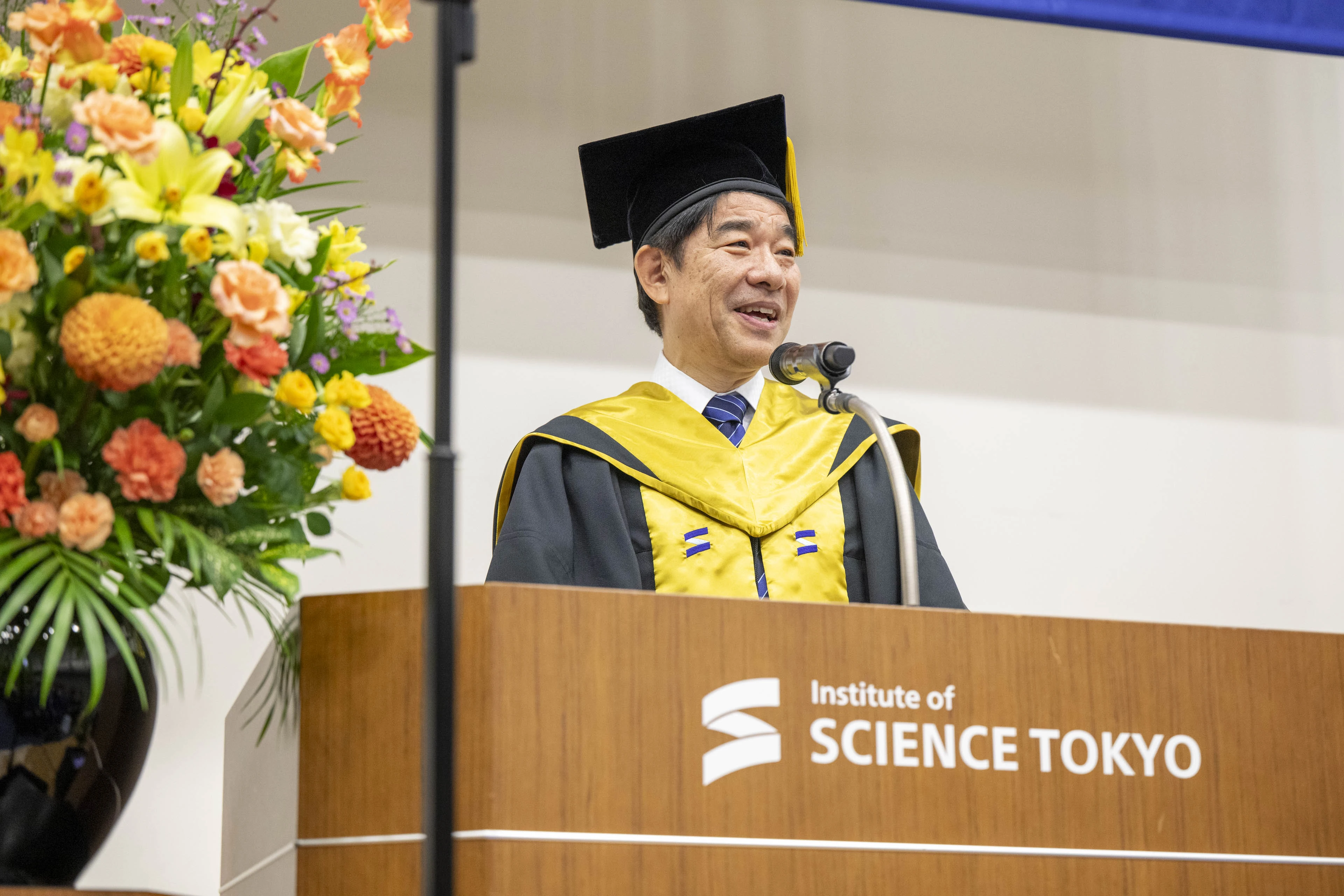 First of all, to all the students completing their degrees, I would like to extend my heartfelt congratulations on your graduation. In the face of rapid change and uncertainty, including the Covid-19 pandemic and unstable international conditions, your determination, creativity, and resilience have been truly remarkable, and we celebrate together the culmination of your hard work. You had the rare experience of seeing your university's name change while you were enrolled here as students. Like President and CAO Tanaka, I want you to take pride in being Science Tokyo graduates.