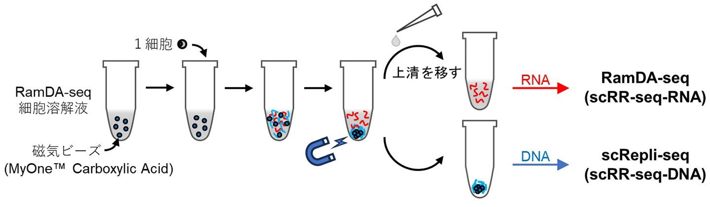 この新しい手法を確立するため、まず1細胞からDNAとRNAを分離する手法を検討しました(図2)。その結果、カルボキシル基を含む磁気ビーズを用いることで、ゲノムDNAを選択的に捕捉できることがわかりました。具体的には、単一細胞を溶解して作ったDNAとRNAを含む溶液中に磁気ビーズを加え、磁気スタンドでビーズに結合したDNAを分離します。これにより、RNAは溶解液中に残り、DNAはビーズに保持されます。この分離操作後に、DNAはscRepli-seq、RNAはRamDA-seqに供しました。