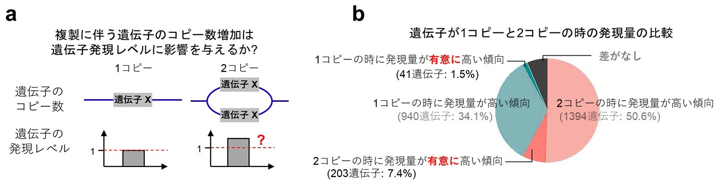 (b) 円グラフは、遺伝子が1コピーの時と2コピーの時の発現パターンを示す。調べた遺伝子のうち7.4%においてのみ、2コピーの時に統計的に有意に発現レベルが高かった。50.6%の遺伝子についても、2コピー遺伝子群でより高い発現を示す傾向が見られたが、その差は統計的に有意ではなかった。