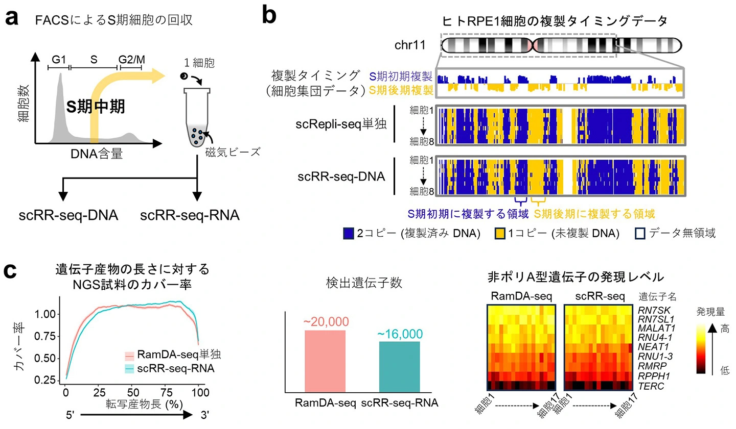 (a)フローサイトメトリー (FACS) により、S期中期のヒトRPE1細胞を一つ一つ分取し、scRR-seqを実施した。得られた結果を、scRepli-seq単独、RamDA-seq単独で得られた結果と比較して評価を行った。