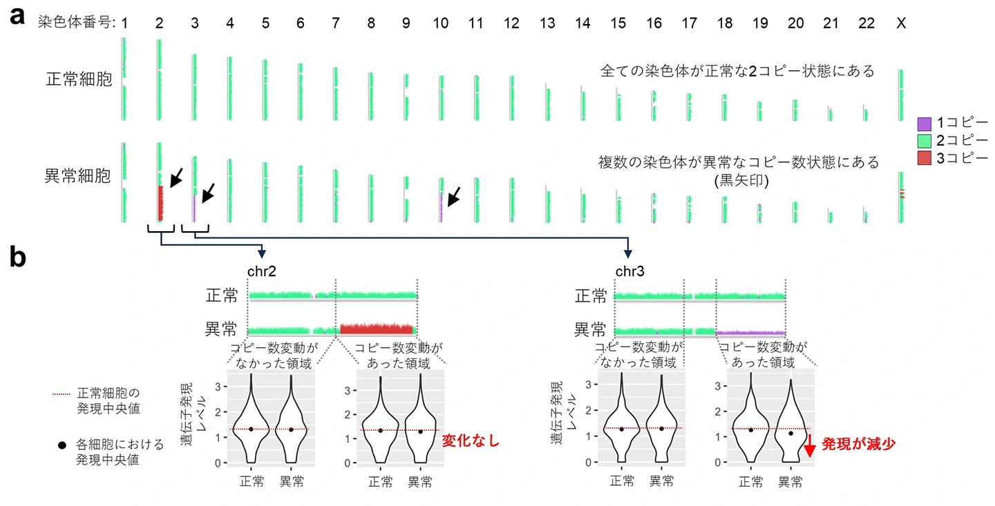 (b) コピー数異常を有する2つの染色体の例を示す。下の図は、染色体の各領域に含まれる遺伝子の発現レベルを表している。黒点は各細胞における発現レベルの中央値を示し、赤線は正常細胞における中央値を示す。2番染色体(chr2)に3コピー異常 をもつ細胞は、正常細胞と同程度の遺伝子発現中央値を示した(左)。一方、3番染色体(chr3)に1コピー異常をもつ細胞は、正常細胞と比べて遺伝子発現レベルが低下していた(右)。