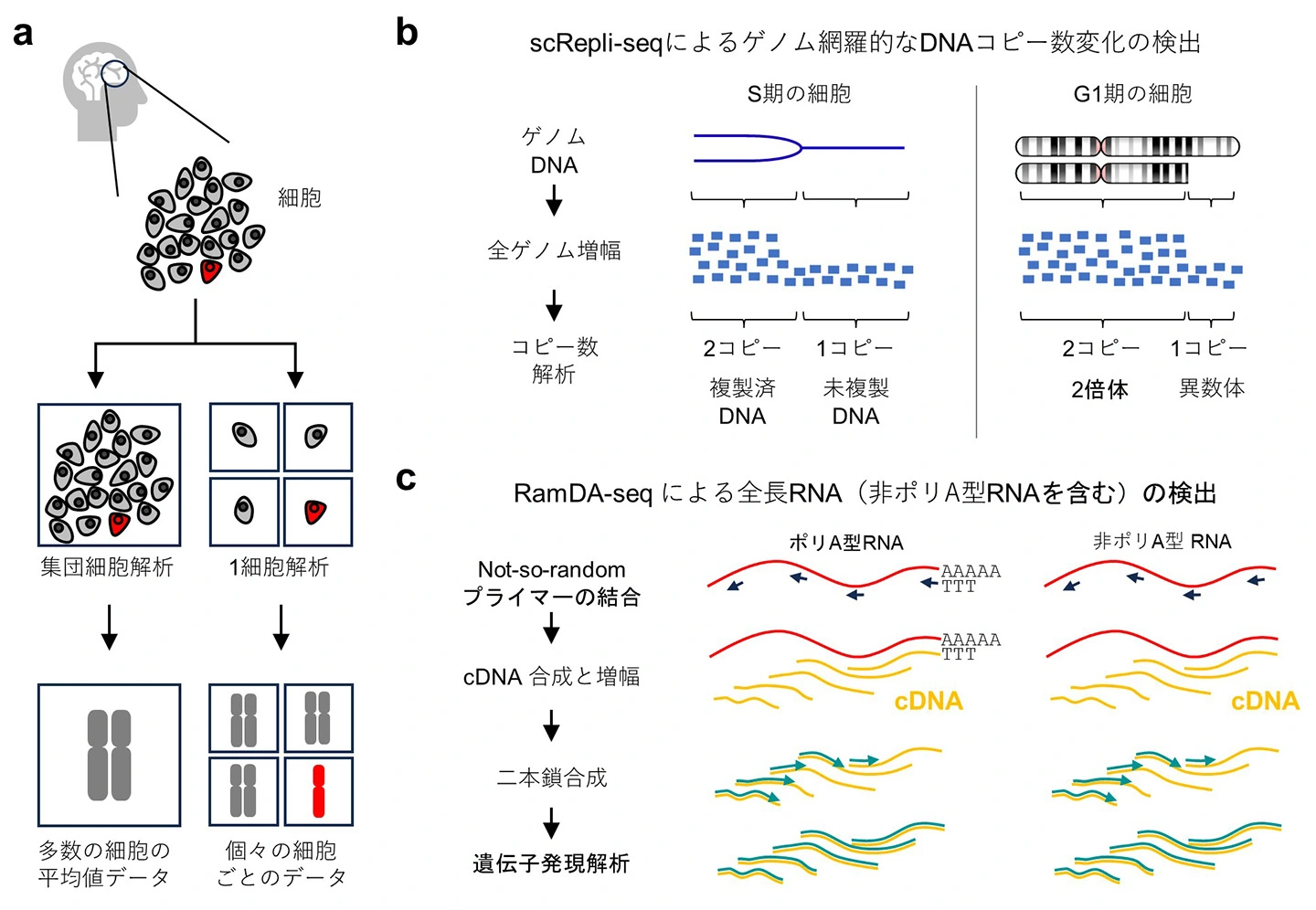 (c) RamDA-seqは、「Not-so-random」プライマーと呼ばれる特殊なプライマー(矢印)を用いたcDNA合成を行い、さらに鎖置換増幅法を行うことで、高感度に1細胞由来のごく微量のRNAを検出する技術である。これにより、完全長RNAの解析が可能となり、ポリ(A)RNAに加えて従来法では捉えられない非ポリ(A)RNAも解析できる。