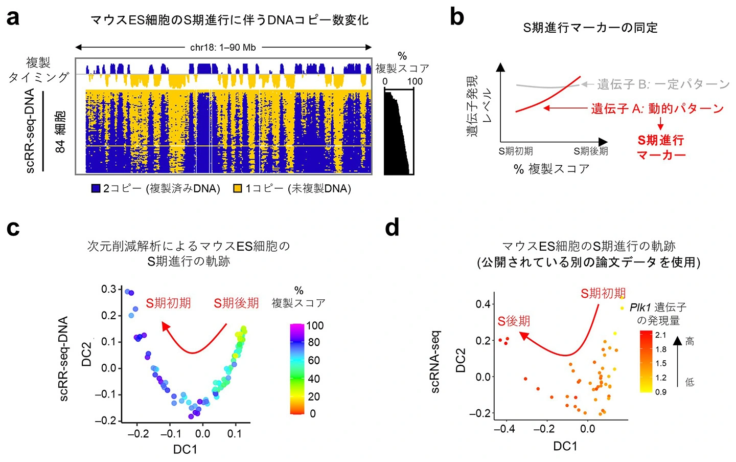 (a) scRR-seq-DNAから得られたCBMS1マウスES細胞の全S期にわたる 複製タイミングのデータ。例として第18染色体(chr18)を示している。コピー数変化のデータを元に算出した細胞ごとのゲノム複製率(複製スコア)を右側に示しており、これにより細胞がS期のどの時期にいるのかを正確に同定できる。