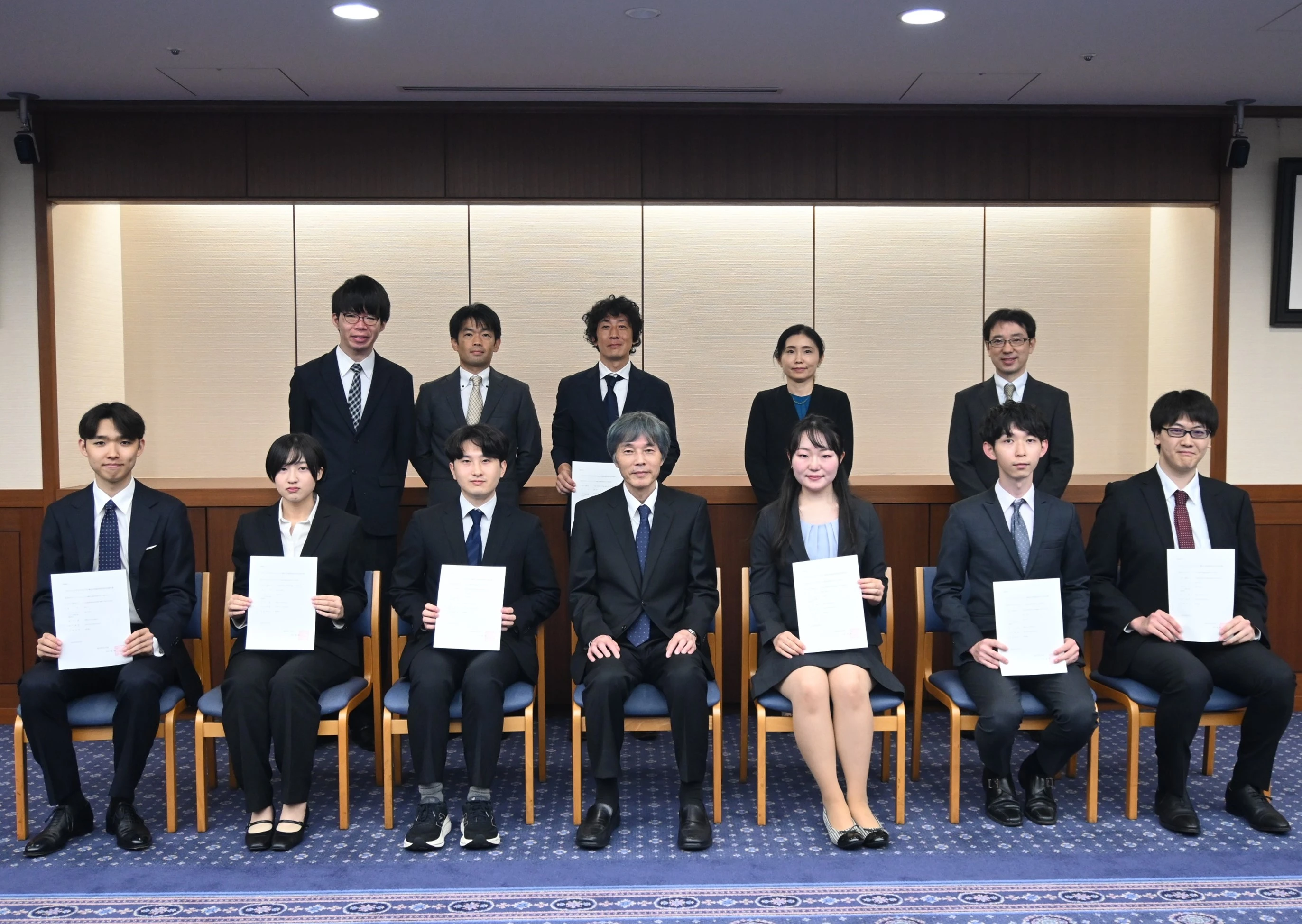 左手前から 伊東巧さん、 佐々木敏莉さん、 守田悠彦さん、 古川執行役副学長、 數田茉莉子さん、 中西一貴さん、 渡部良平さん