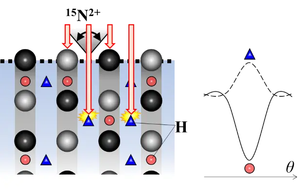- 共鳴核反応法:Nuclear reaction analysis(NRA)。加速した高エネルギーイオンと標的原子の核反応を利用して元素を非破壊検出する実験法。本研究では15NイオンとHの核反応1H(15N,αγ)12Cにより放出されるγ線を計測することでHを検出する。核反応の共鳴幅が小さいことから、15Nイオンビームの入射エネルギー掃引によりH濃度の深さ分布をnmオーダーで取得できる。さらにγ線のエネルギー解析により、水素同位体である軽水素(H)と重水素(D)の区別が可能である。