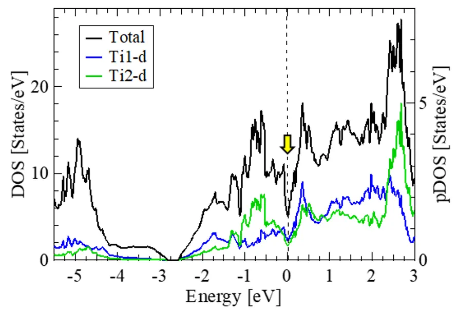 これまでδ-チタン水素化物では、水素はTサイトのみを占有すると考えられてきました。そこでOサイト部分占有の物理的起源を解明するため、水素の配置を考慮して網羅的に第一原理電子状態計算[用語3]を実行しました。その結果、TiH1.5では水素のOサイト部分占有によって結晶の対称性を低下させることでフェルミレベル近傍に擬ギャップを形成し、構造が安定化していることを明らかにしました(図3)。分子や金属酸化物でよく知られたヤーン・テラー効果[用語4]に対し、水素配置による構造安定化機構として“水素ヤーン・テラー効果”という新しい概念を提唱しました。これは水素を含む物質で一般的に成り立つ概念で、特異な電子状態に起因した新奇物性探索の指針となることが期待されます。