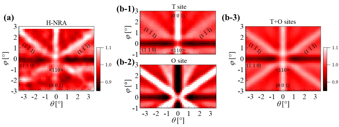 図2(a)に反応性スパッタリングにより作製した膜厚90 nmのチタン水素化物TiH1.47エピタキシャル薄膜中の水素原子の位置を解析した結果を示します。(0 0 1),(1 1 ̅ 1 ̅ ),(1 1 ̅ 1)面でNRA収量の増加、(1 ̅ 1 0)面で減少が観測されました。これは、水素原子が前者のチャネル面上の格子位置を占めていることを示しています。図2(b-1,2)に水素が四面体(T)サイトもしくは八面体(O)サイトを占めた場合のシミュレーション結果を示します。実験結果とシミュレーションとの詳細な比較により、89%の水素がTサイト、11%の水素がOサイトを共占有した構造(b-3)であることがわかりました。
