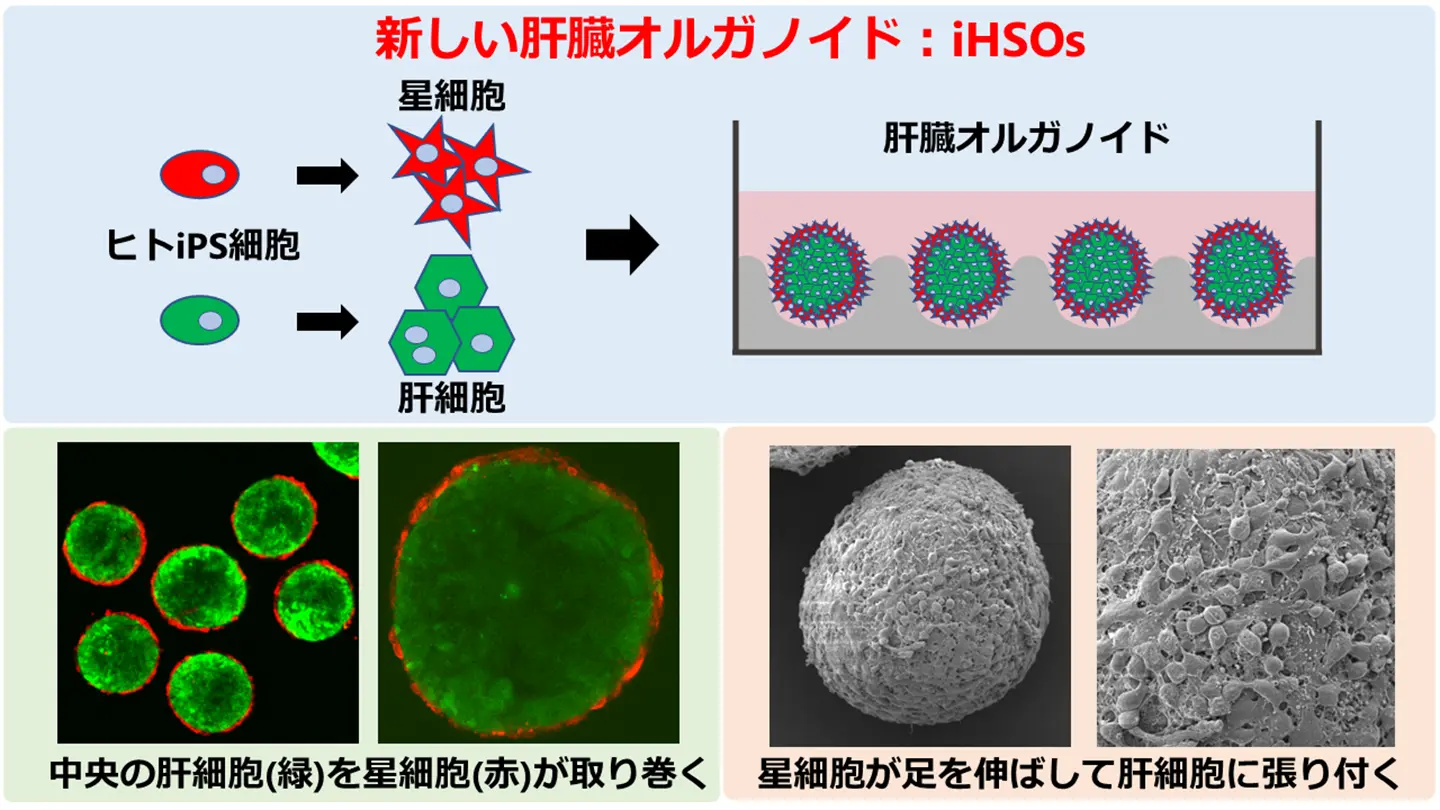- iHSOは再生肝に似た性質を持ち、肝星細胞膜上のICAM-1を介したクロストークによって、サイトカインを豊富に産生する肝星細胞が肝細胞の増殖を支えることを明らかにしました。