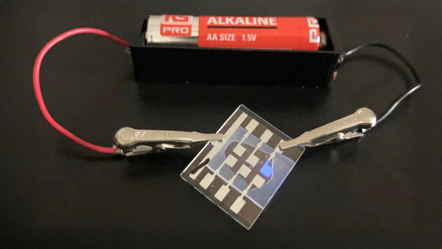 図1.乾電池(1.5 V)1本で深青色有機ELを光らせている写真