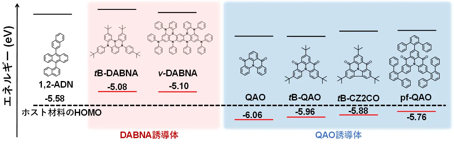 図3.UC-OLEDのホスト材料、蛍光ドーパント材料の分子構造とエネルギー準位