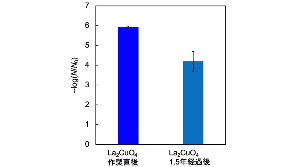 さらに、研究グループは、合成後大気下で1年半経過したLa2CuO4の抗ウイルス活性を評価し、長期的な安定性を有することを確認しました。具体的にはLa2CuO4が、Cu2Oより高い安定性を持ち、高い抗ウイルス活性を長期間維持することが確認されました(図4)。