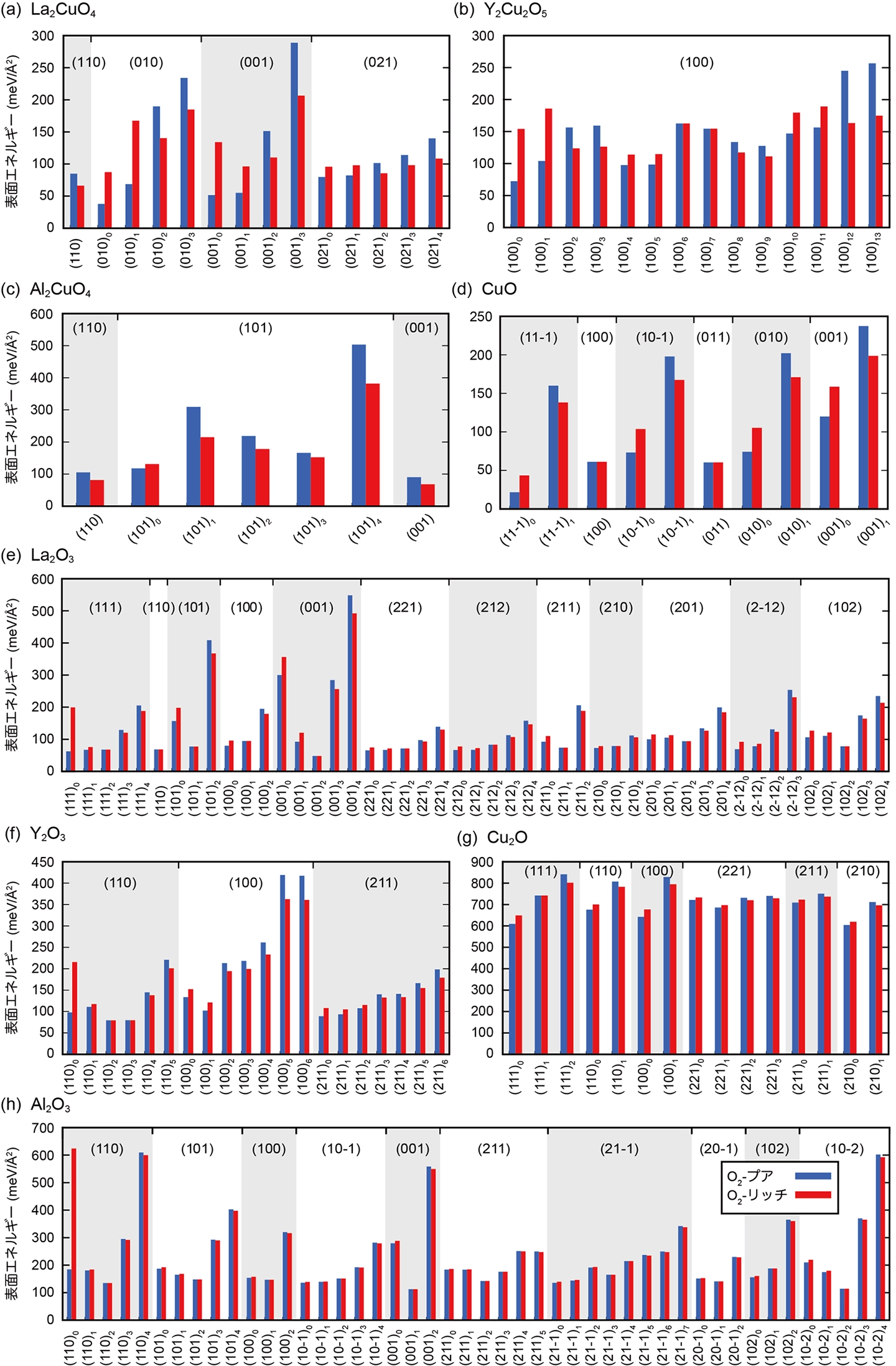 吸着試験とタンパク質不活化試験の結果、抗ウイルス活性の発現には、静電相互作用やリン酸親和性によるウイルスの吸着と、吸着後のタンパク質不活化が寄与している可能性が高いことが明らかとなりました。特に、今回設計した複合酸化物は、それらが強化されたことが確認されました。静電相互作用とタンパク質不活化の強化の評価にあたって、研究グループは表面モデルを構築するソフトウェアを開発し、固体表面に関する系統的な第一原理計算を実施しました(図3)。図3において、赤色と青色の棒グラフはそれぞれ酸素リッチ[用語7]、酸素プア[用語8]な状態での表面エネルギーを表しています。大気中には、比較的酸素が多いことから、酸素リッチな状態で安定な表面構造を選出し、理論検討した結果、 (1)CuOの表面エネルギー(図3(d))がCu2O(図3(g))よりも安定であること、(2)複合酸化物表面が金属イオンの多い状態で安定化すること、(3)複合酸化物の最表面のCuがCu+に近い状態となって安定化していることの3点が明らかとなりました。